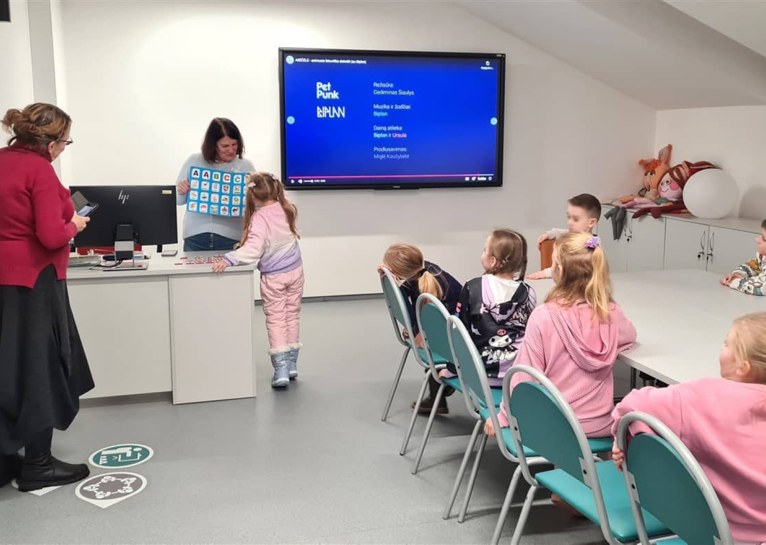 Priešmokyklinukai žiūrėjo animacinį filmuką „Animuota lietuviška abėcėlė“, mokėsi jungti skiemenis į žodžius ir skaitė.