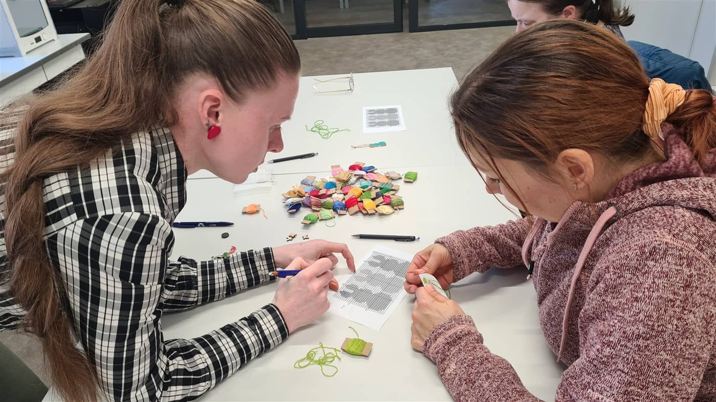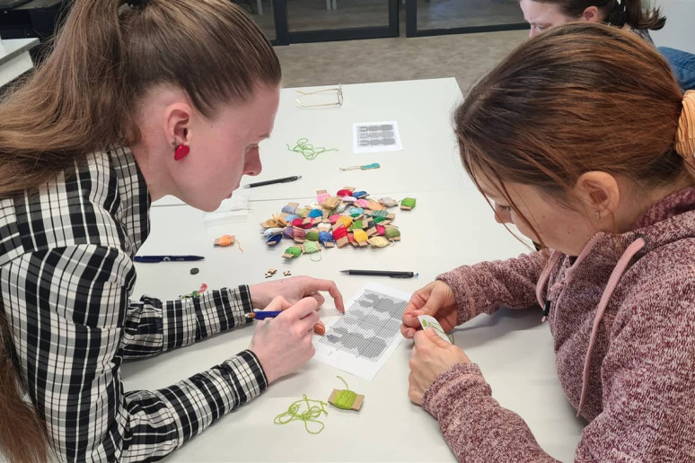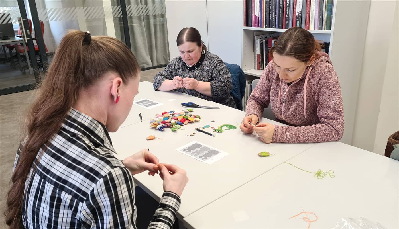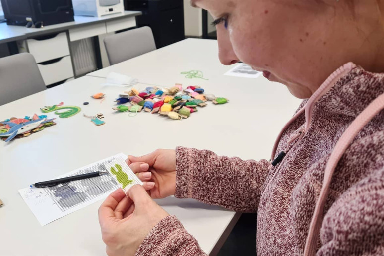 Edukatorė supažindino dalyves su siuvinėjimo pagrindais ir pakvietė praktiškai išbandyti šią techniką. Susirinkusiosios kūrė velykinę dekoraciją – siuvinėtą kiškį ant plastikinės kanvos.
