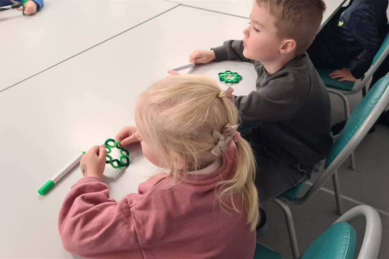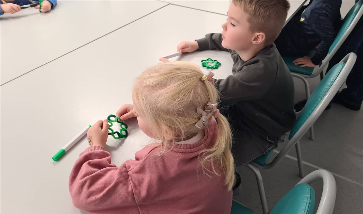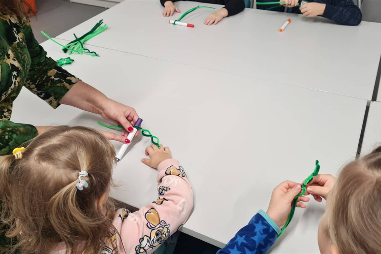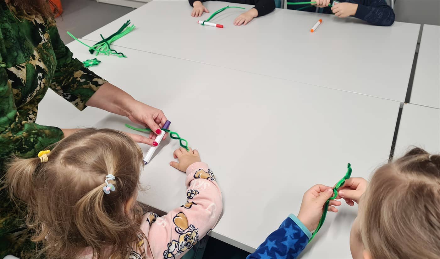 Galiausiai sekė kūrybinė užduotis – kalėdinės žvaigždės iš šenilo vielučių lankstymas. Padedant darbuotojai ir auklėtojoms, vaikai sukūrė žalsvų atspalvių žvaigždes, kurios papuoš jų eglutes.