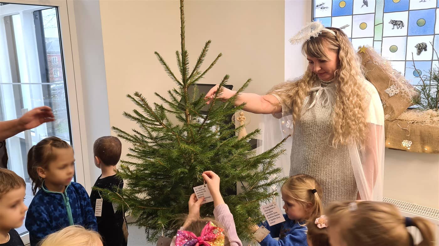 Bibliotekininkės kalbėjo ne tik apie senuosius papročius, bet ir apie tai, kad prieš 150 metų gimė garsiausias Lietuvos kompozitorius ir dailininkas Mikalojus Konstantinas Čiurlionis. Mažasis Kastukas, taip kompozitorius buvo vadinamas vaikystėje, galvodavo, kad Kalėdinę eglutę atneša angelas. Šiandien angelą įkūnijusi bibliotekos darbuotoja nešina Kalėdų eglute aplankė ir mūsų svečius. Ji kvietė vaikus puošti eglutę palinkėjimų atvirukais, kuriuose įamžinti M. K. Čiurlionio paveikslų motyvai. Vaikai džiaugėsi draugija bei mielai įsitraukė į veiklą.