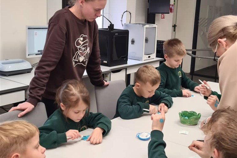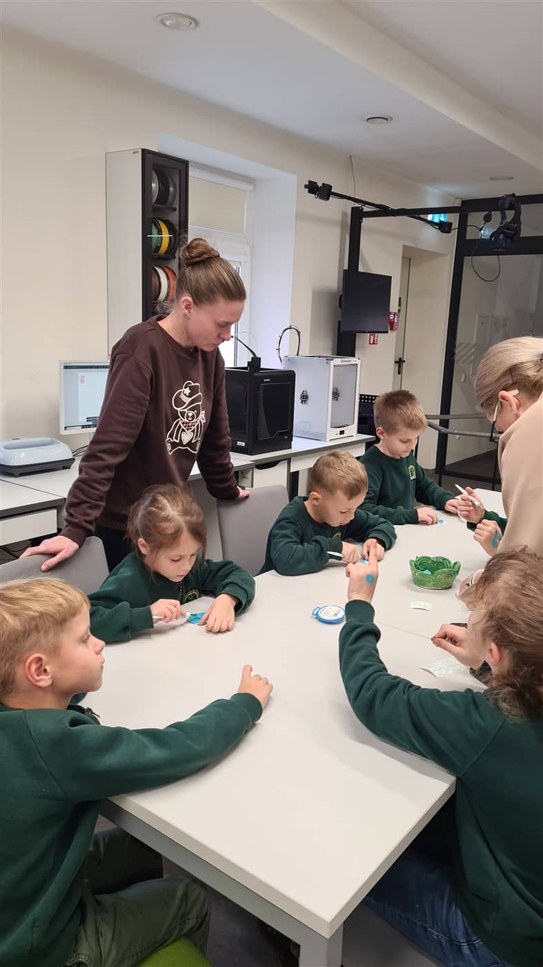 Bibliotekos darbuotojos Vaida ir Karolina supažindino vaikus su lipdukų gamybos procesu. Dalyviai stebėjo, kaip idėjos virsta realiais gaminiais, o vėliau patys atspausdintus lipdukus paruošė klijavimui. Tai buvo įdomi patirtis, leidusi iš arčiau pažinti kūrybinių technologijų pasaulį.