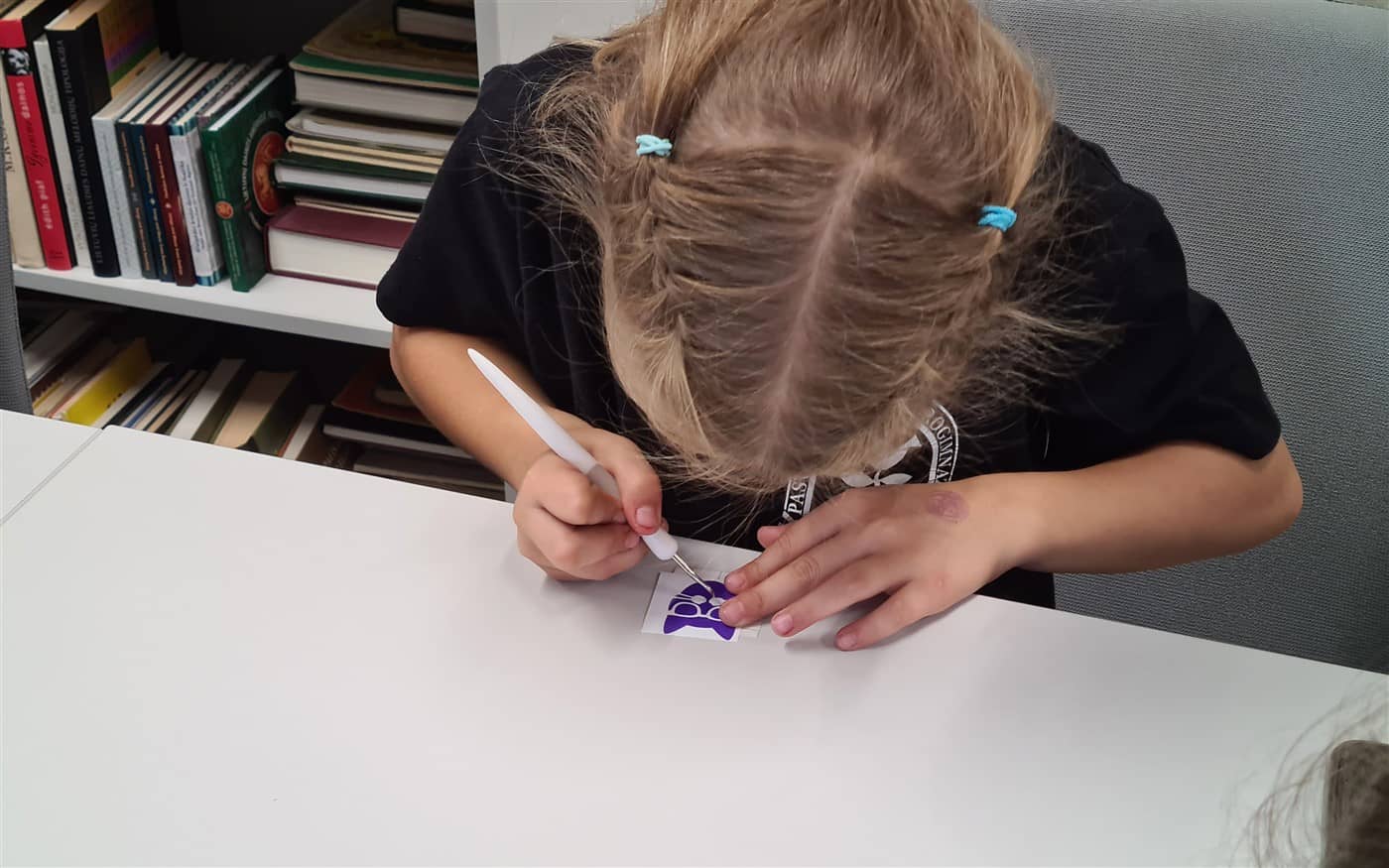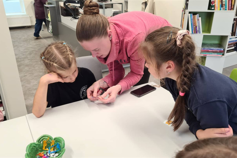 Bibliotekos darbuotojos Vaida ir Karolina šį kartą supažindino vaikus su lipdukų gamybos procesu. Dalyviai stebėjo, kaip idėjos virsta realiais gaminiais, o vėliau patys išbandė įrangą ir pasirinko norimus lipdukų dizainus. Tai buvo įdomi patirtis, leidusi iš arčiau pažinti kūrybinių technologijų pasaulį.
