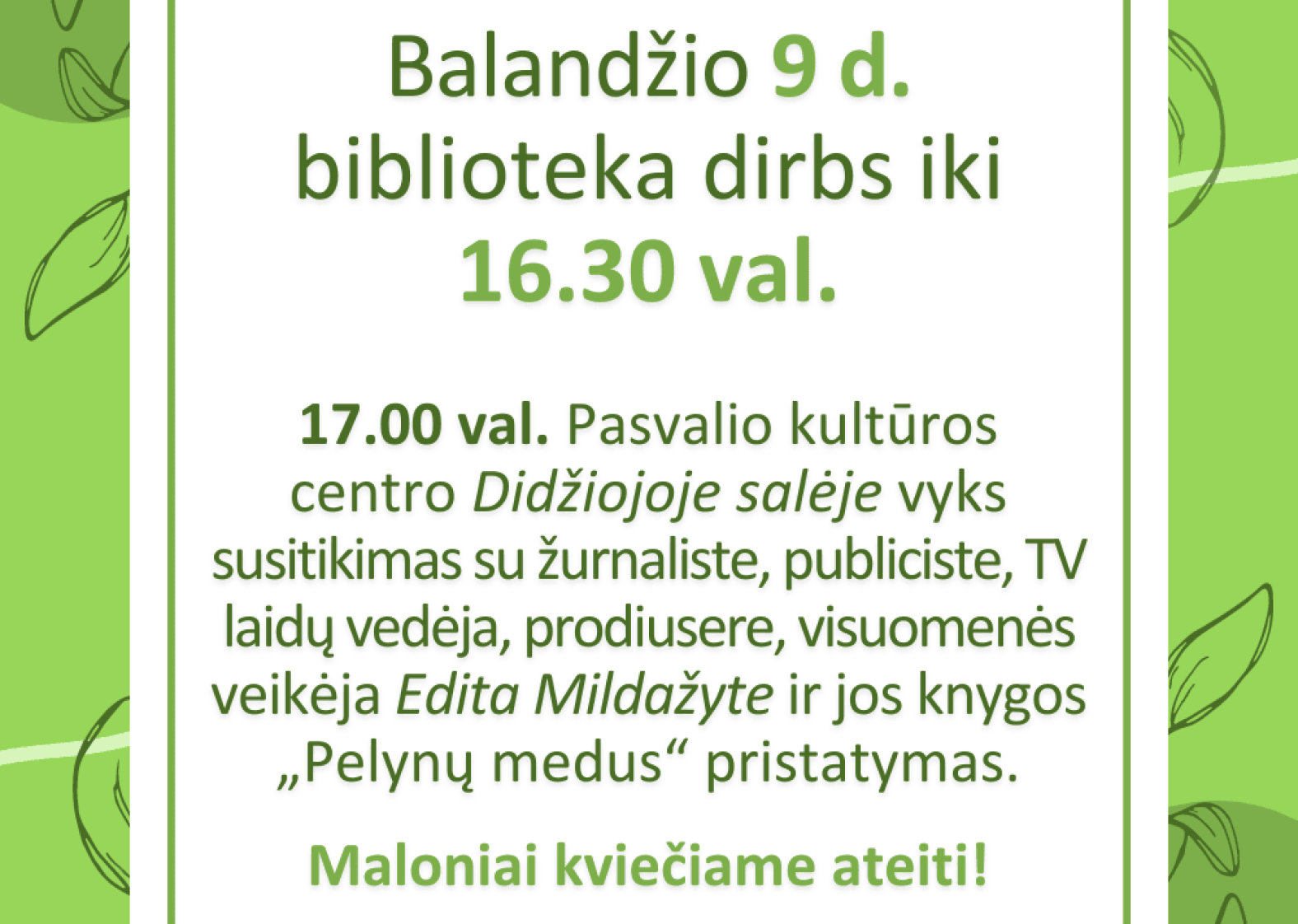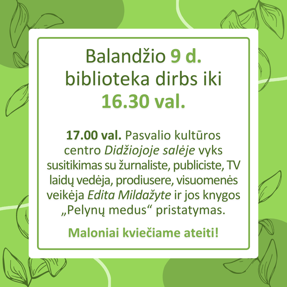 Informuojame, kad balandžio 9 d. (ketvirtadienį) biblioteka dirbs iki 16.30 val.