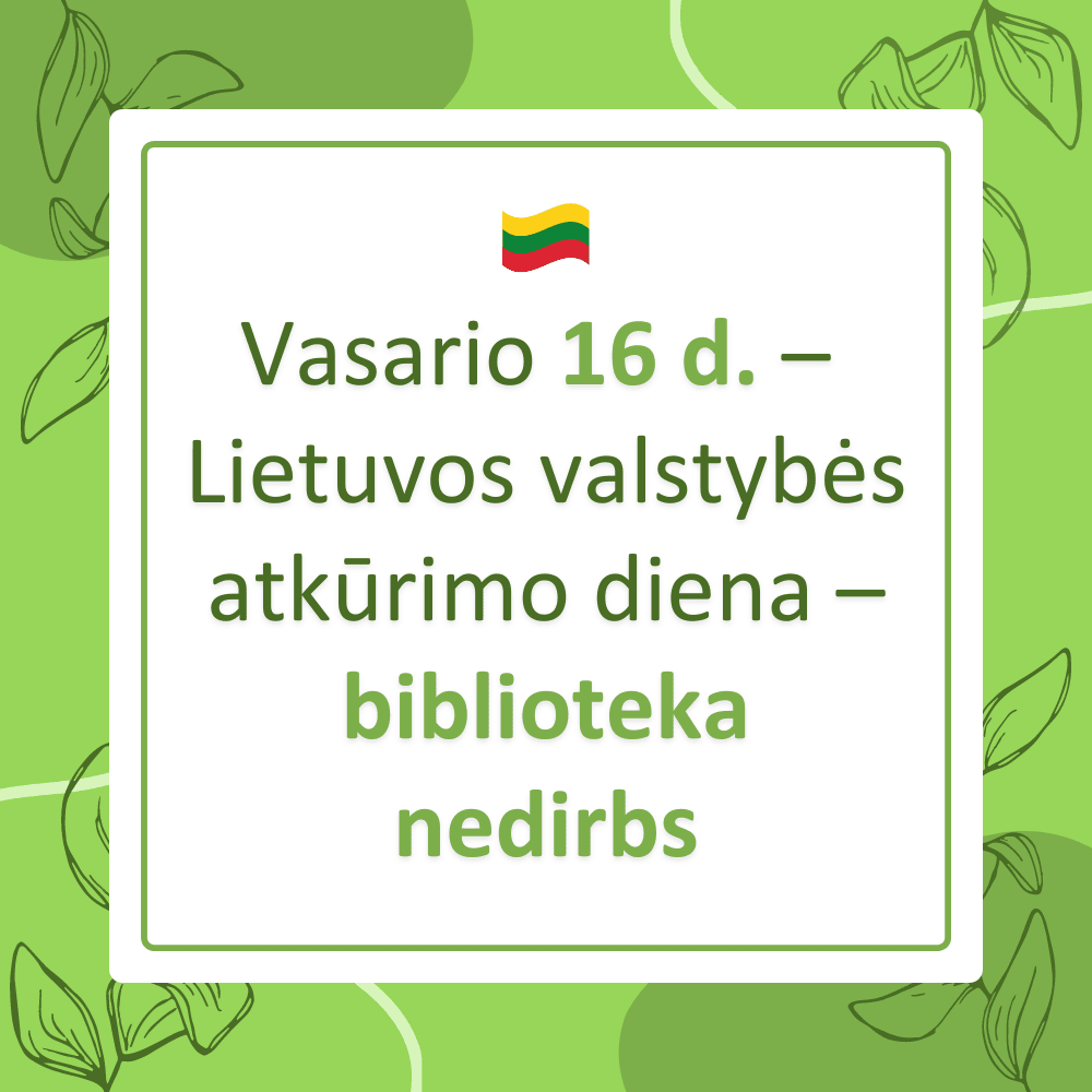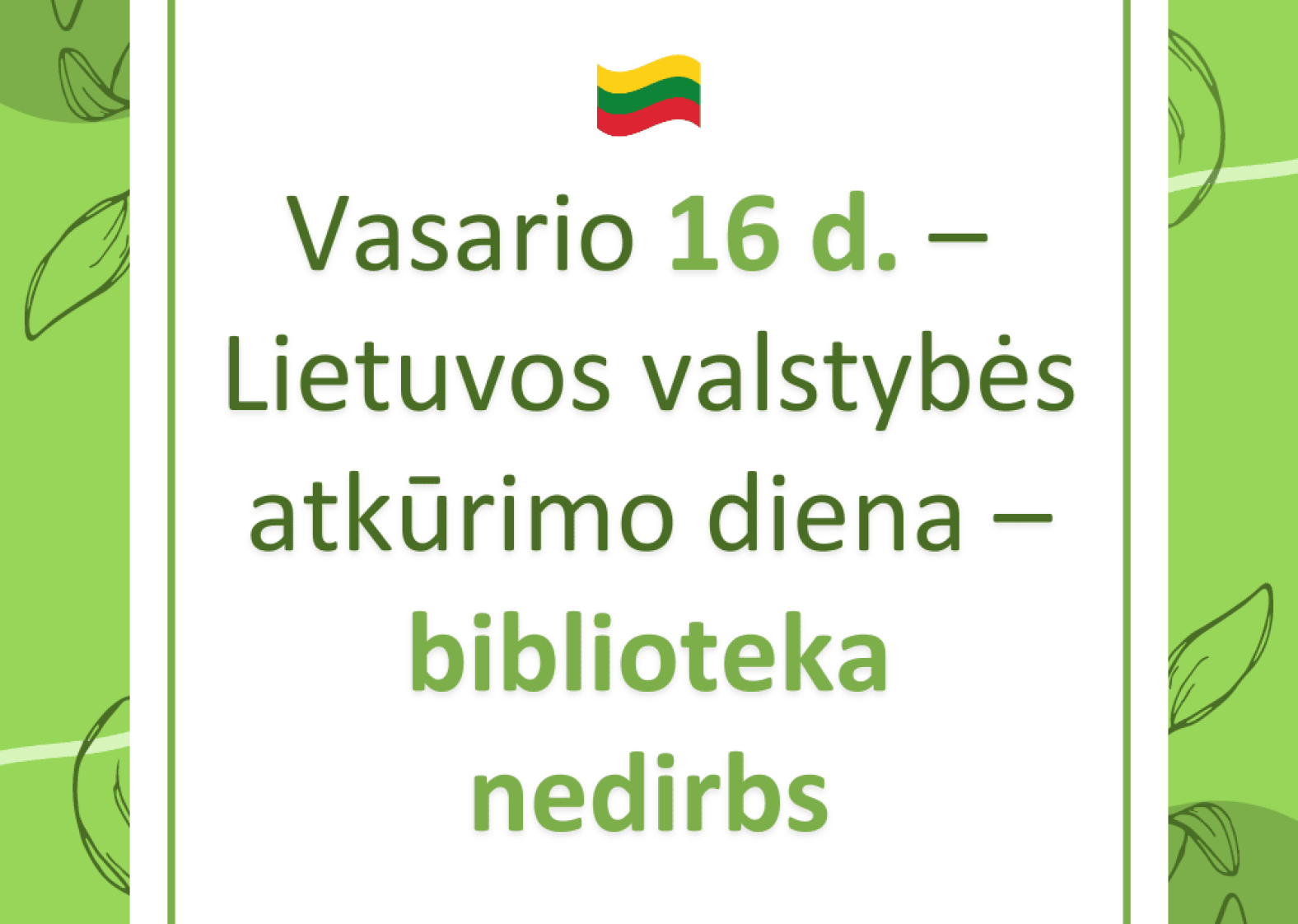 Informuojame, kad Vasario 16-ąją, Lietuvos valstybės atkūrimo dieną, biblioteka nedirbs.