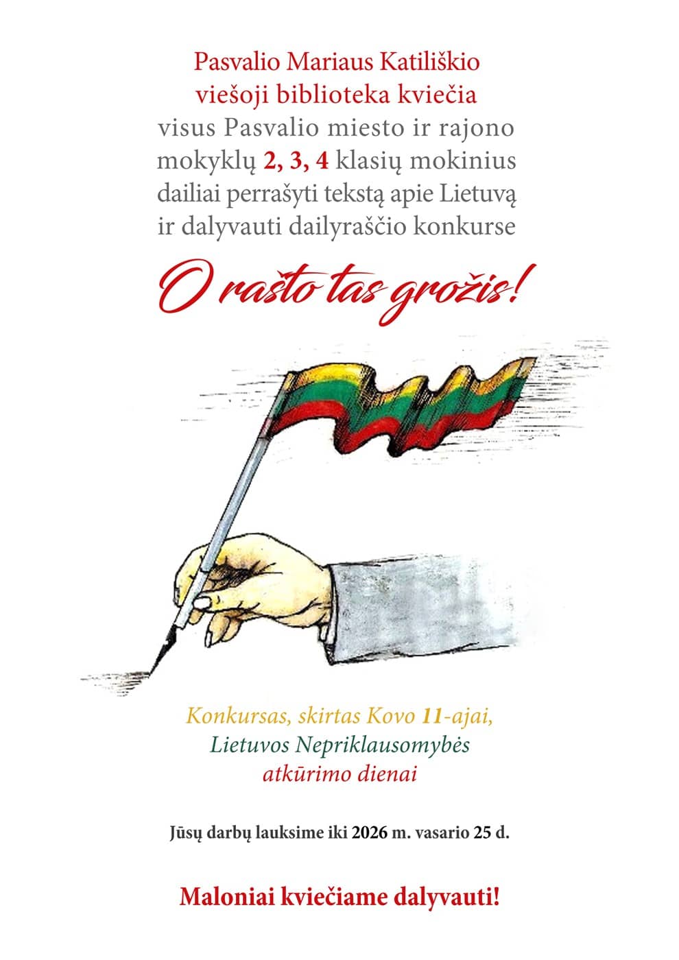 Pasvalio Mariaus Katiliškio viešoji biblioteka kviečia visus Pasvalio miesto ir rajono mokyklų 2, 3, 4 klasių mokinius dailiai perrašyti tekstą apie Lietuvą ir dalyvauti dailyraščio konkurse „O RAŠTO TAS GROŽIS!“