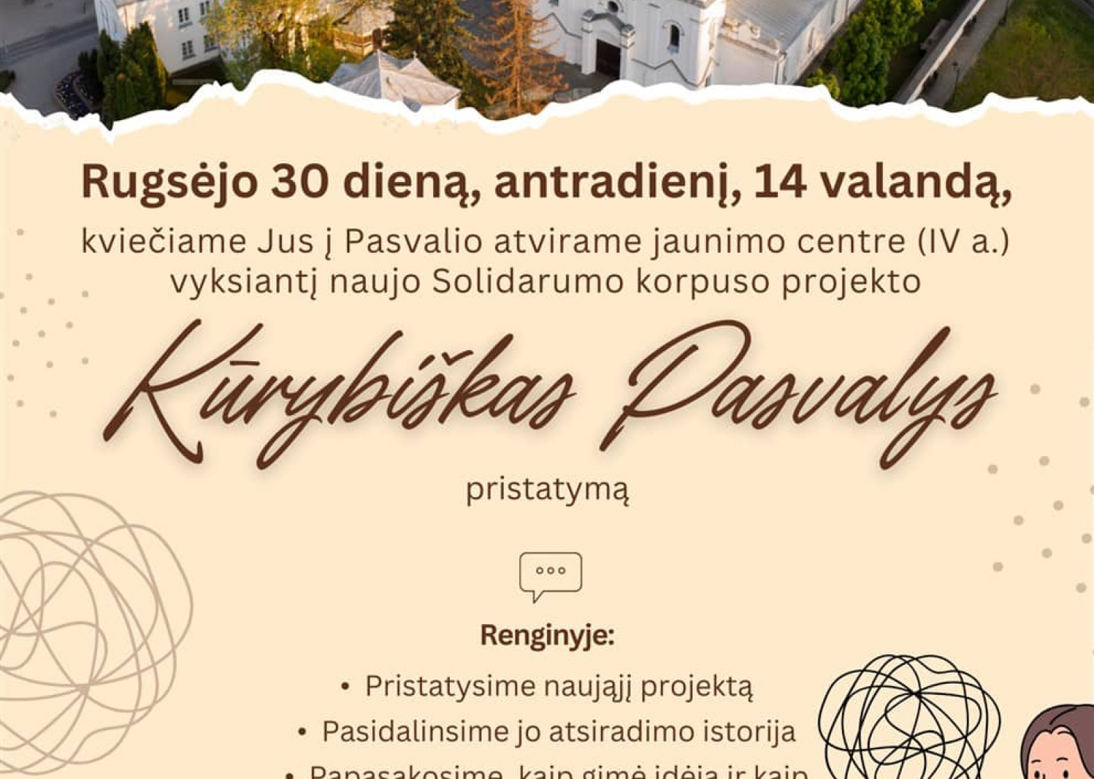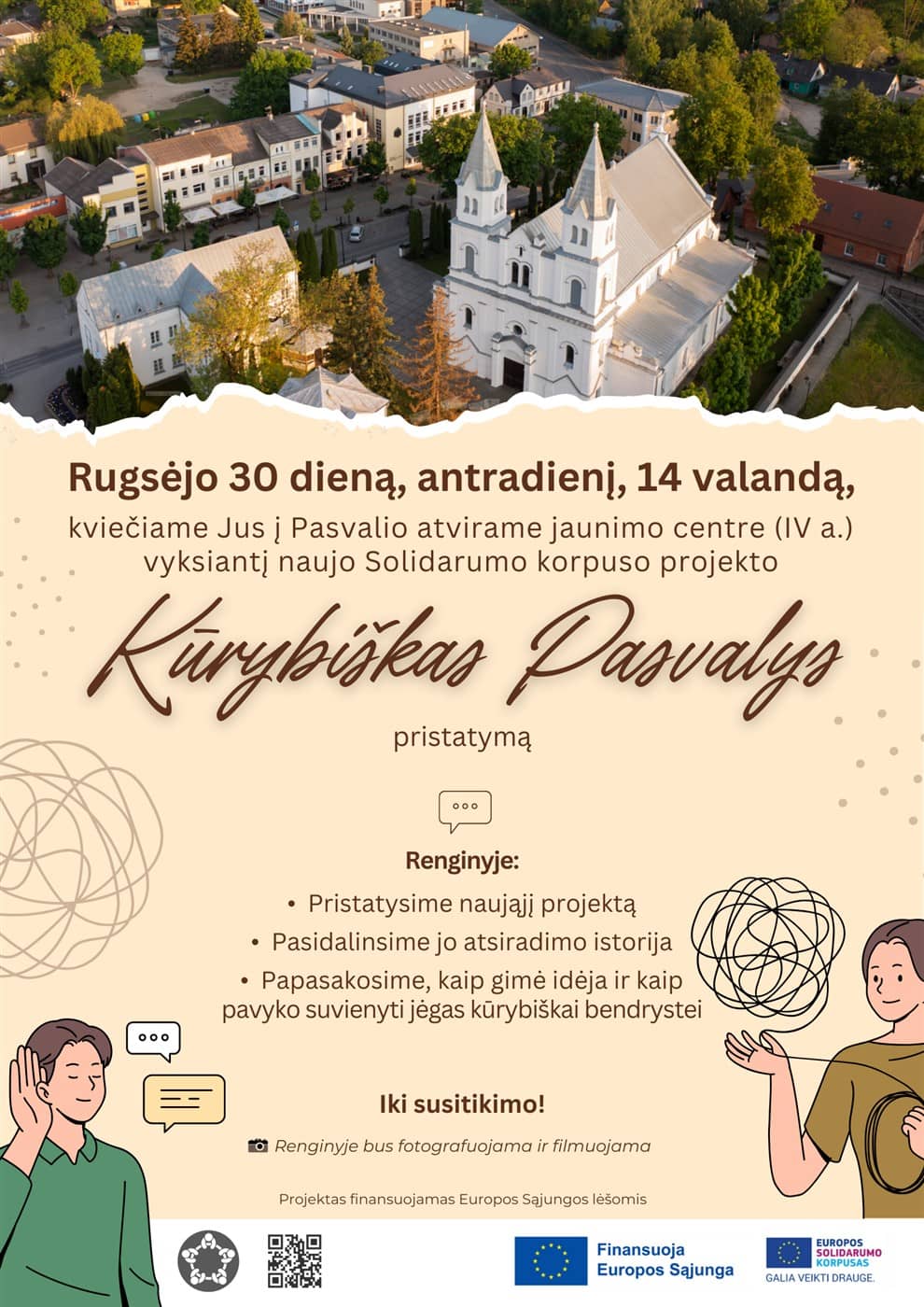 Rugsėjo 30 dieną, antradienį, 14 valandą, kviečiame Jus į Pasvalio atvirame jaunimo centre (IV a.) vyksiantį naujo Solidarumo korpuso projekto „Kūrybiškas Pasvalys“ pristatymą.