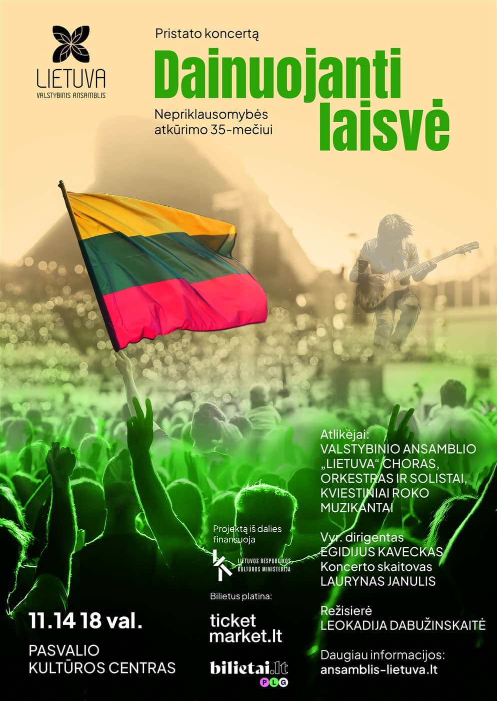 Ansamblis „Lietuva” pristato muzikinę programą „Dainuojanti laisvė”, kurioje atgims legendinės Dainuojančios revoliucijos ir Atgimimo laikotarpio dainos. Dainos, kurios mums savos, pažįstamos, neretai ir nostalgiją keliančios, šiame koncerte suskambės naujai – kaip prieš 35 metus telkė ir žadino dvasią, taip ir šiandien primins mūsų ryžtą kovoje už Nepriklausomybę.