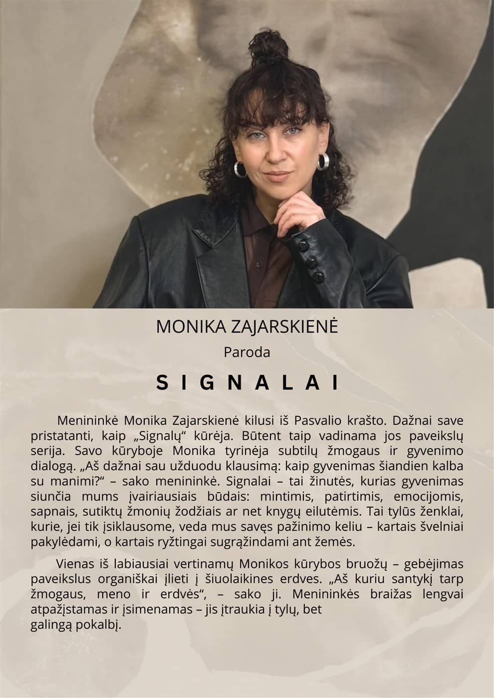Menininkė Monika Zajarskienė kilusi iš Pasvalio krašto. Dažnai save pristatanti, kaip „Signalų“ kūrėja. Būtent taip vadinama jos paveikslų serija. Savo kūryboje Monika tyrinėja subtilų žmogaus ir gyvenimo dialogą. „Aš dažnai sau užduodu klausimą: kaip gyvenimas šiandien kalba su manimi?“ – sako menininkė. Signalai – tai žinutės, kurias gyvenimas siunčia mums įvairiausiais būdais: mintimis, patirtimis, emocijomis, sapnais, sutiktų žmonių žodžiais ar net knygų eilutėmis. Tai tylūs ženklai, kurie, jei tik įsiklausome, veda mus savęs pažinimo keliu – kartais švelniai pakylėdami, o kartais ryžtingai sugrąžindami ant žemės.