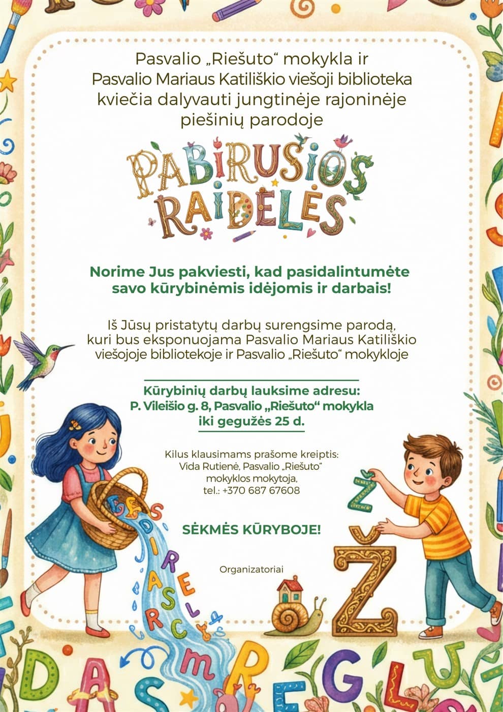 Pasvalio „Riešuto“ mokykla ir Pasvalio Mariaus Katiliškio viešoji biblioteka kviečia dalyvauti jungtinėje rajoninėje piešinių parodoje „Pabirusios raidelės“.