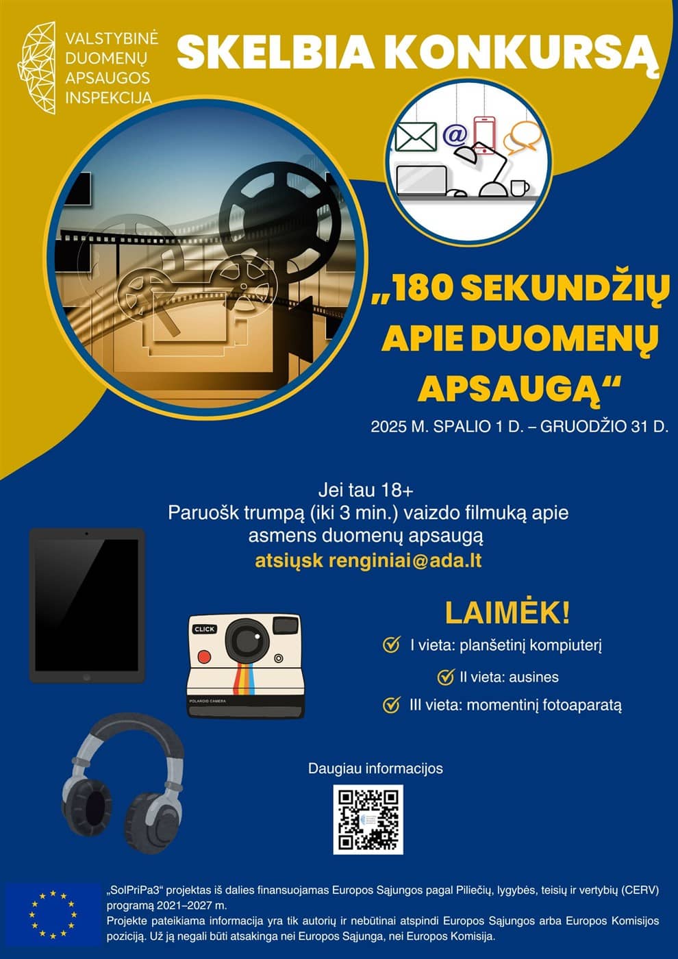 Valstybinė duomenų apsaugos inspekcija kviečia dalyvauti trumpų vaizdo filmų konkurse „180 sekundžių apie duomenų apsaugą“. Jei tau jau 18+ metų ir nori save išbandyti trumpų vaizdo filmų konkurse, nedvejok!