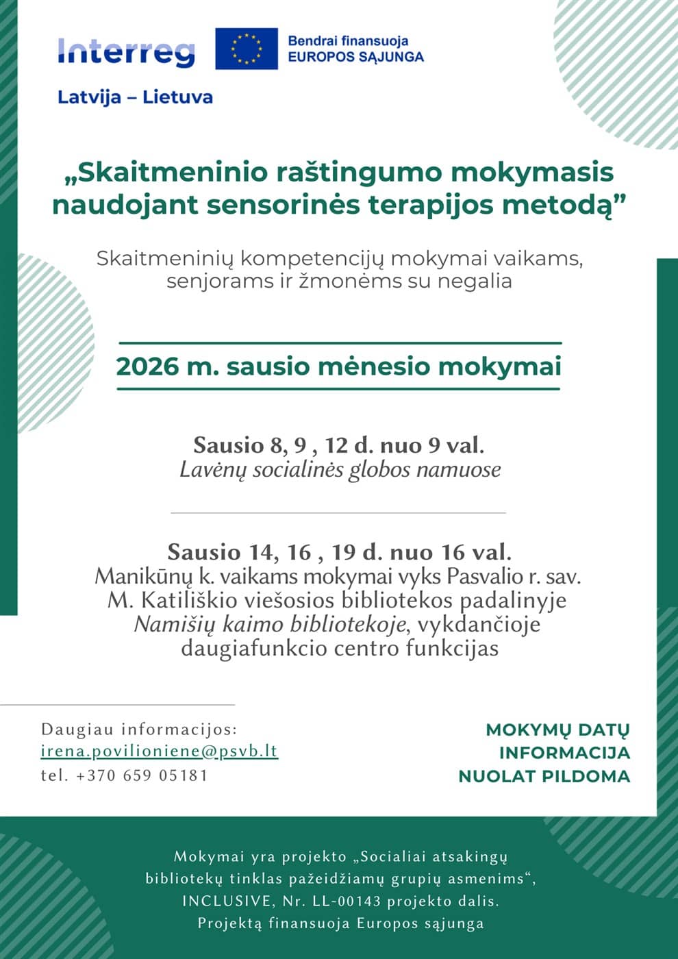 Pasvalio Mariaus Katiliškio viešoji biblioteka vykdydama tarptautinį projektą „Socialiai atsakingų bibliotekų tinklas pažeidžiamų grupių asmenims“, INCLUSIVE, Nr. LL-00143, organizuoja mokymus „Skaitmeninio raštingumo mokymasis naudojant sensorinės terapijos metodą“. Mokymais siekiama skatinti atokesnių Pasvalio rajono vietovių vaikų, senjorų, negalią turinčių žmonių socialinę įtraukti užtikrinant pasiekiamumą, švietimą ir profesionalią pagalbą.