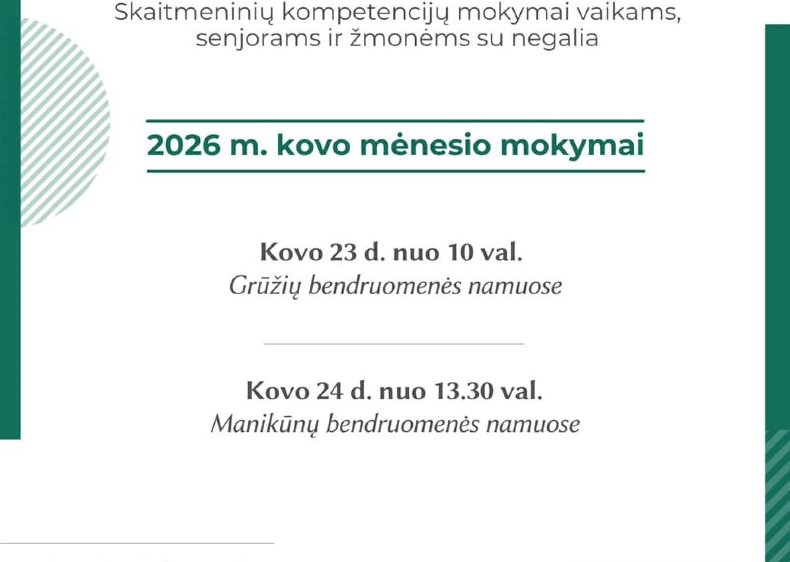 Kviečiame Pasvalio rajono gyventojus, bendruomenių narius registruotis, dalyvauti organizuojamose mokymuose. Jeigu norėtumėte šiuos mokymus surengti savo gyvenamoje vietovėje – susisiekite ir mes pas Jus atvyksime!