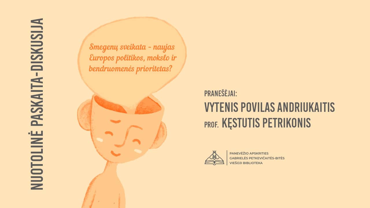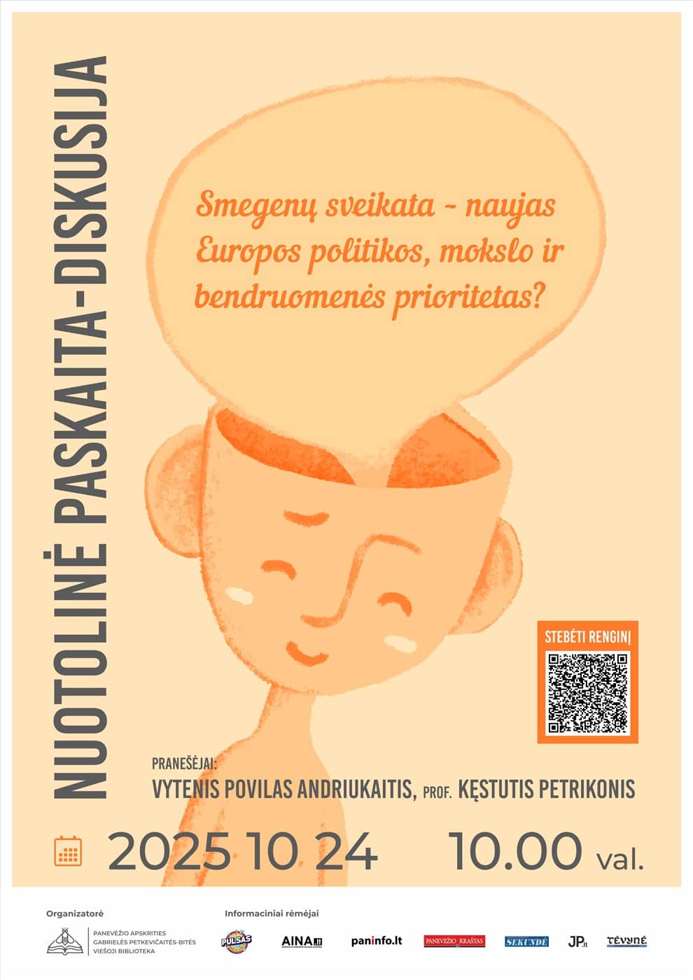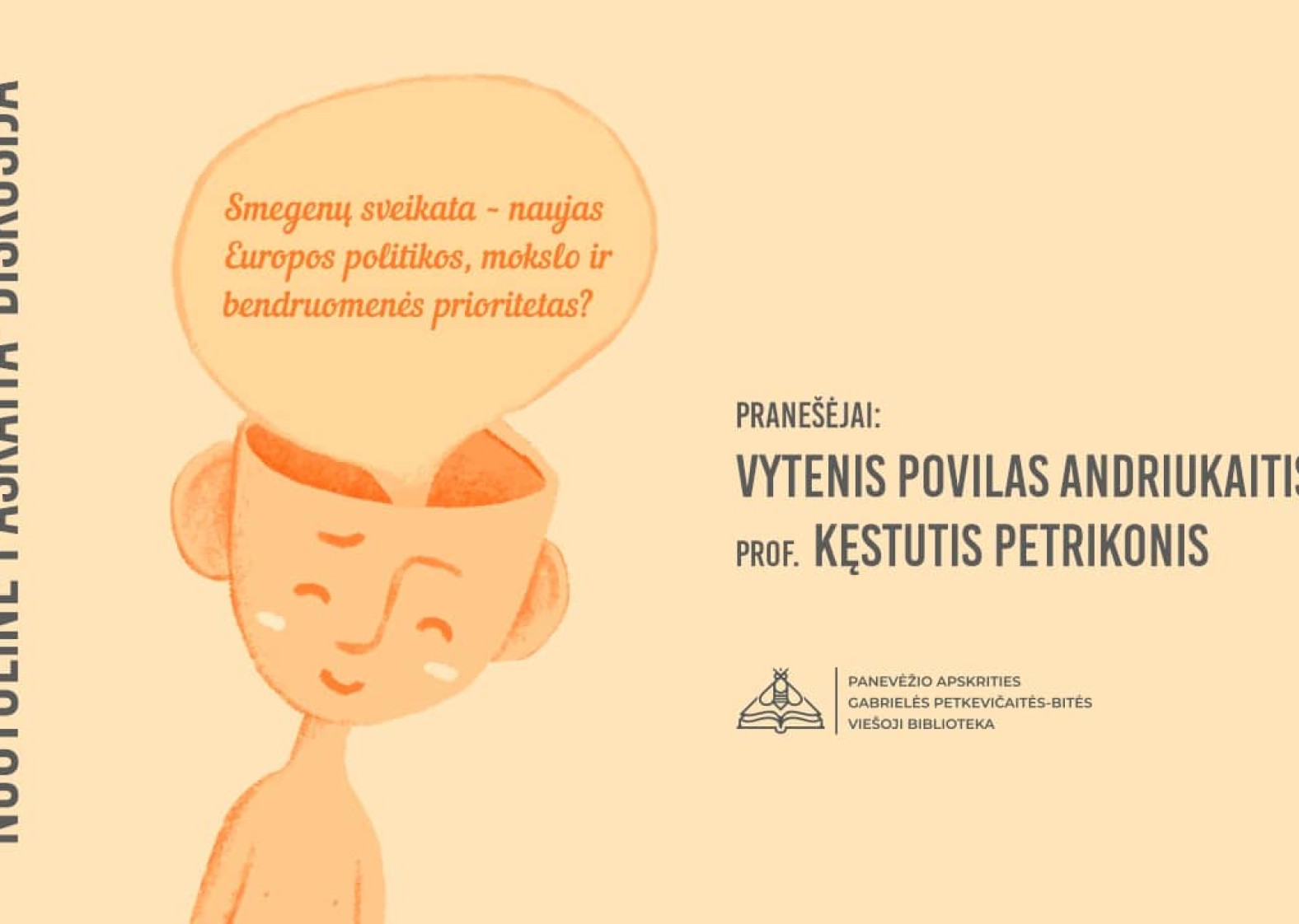 Spalio 24 d. 10 val. kviečiame dalyvauti nuotolinėje paskaitoje-diskusijoje „Smegenų sveikata – naujas Europos politikos, mokslo ir bendruomenės prioritetas?“. Jos tikslas – skatinti žmones rūpintis savo miego, fizinio aktyvumo, psichologinės gerovės įpročiais, įgyti mokslo žinių apie sveikatą.