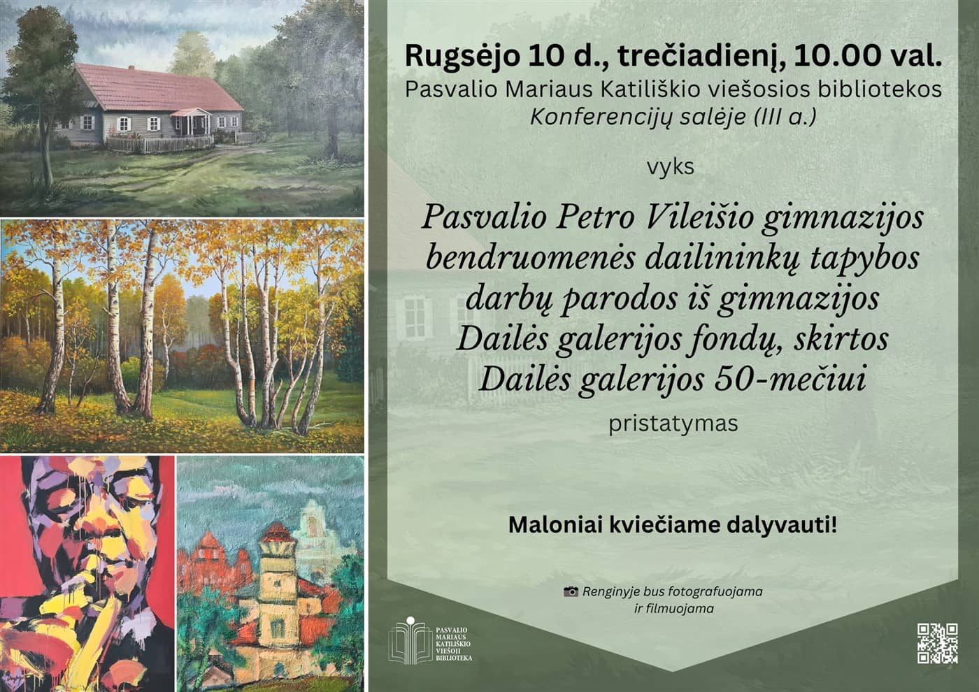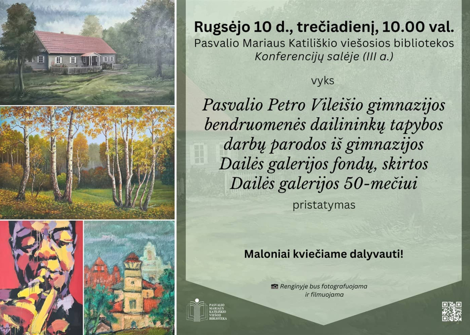Rugsėjo 10 d., trečiadienį, 10.00 val. Pasvalio Mariaus Katiliškio viešosios bibliotekos Konferencijų salėje (III a.) vyks Pasvalio Petro Vileišio gimnazijos bendruomenės dailininkų tapybos darbų parodos iš gimnazijos Dailės galerijos fondų, skirtos Dailės galerijos 50-mečiui pristatymas.