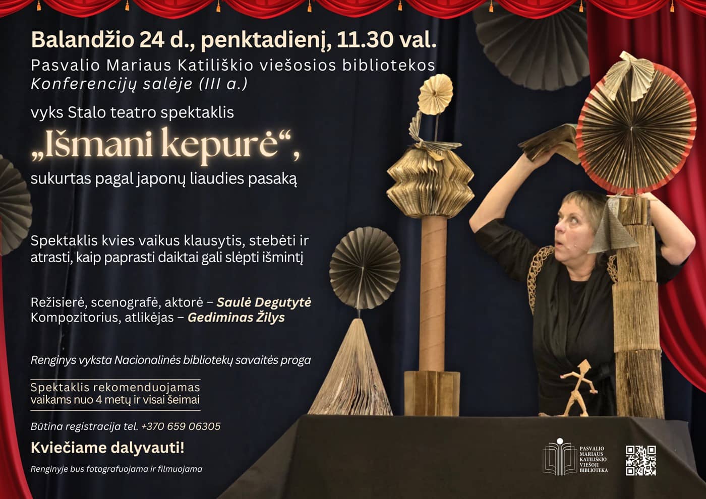 Balandžio 24 d., penktadienį, 11.30 val., Pasvalio Mariaus Katiliškio viešosios bibliotekos Konferencijų salėje (III a.) vyks Stalo teatro spektaklis „Išmani kepurė“, sukurtas pagal japonų liaudies pasaką.