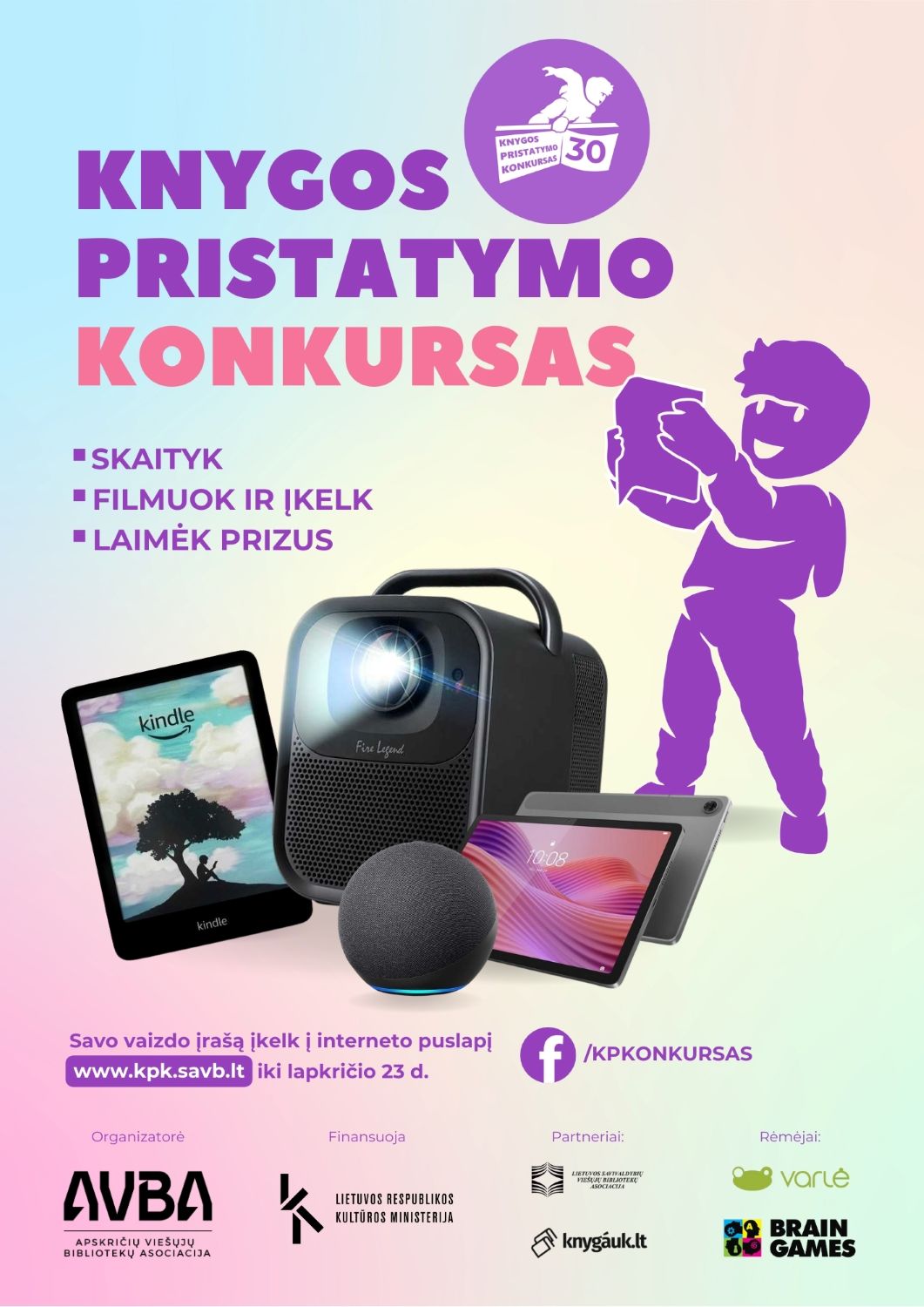 Tris dešimtmečius gyvuojantis Knygos pristatymo konkursas skelbia jubiliejinio sezono pradžią. Apskričių viešųjų bibliotekų asociacija kviečia įvairaus amžiaus skaitytojus pasidalinti savo literatūriniais atradimais, sukuriant originalų vaizdo klipą. Ši iniciatyva, tapusi respublikine tradicija, skatina ne tik domėjimąsi knyga, bet ir ugdo šiuolaikinius skaitmeninius bei kūrybinius įgūdžius.
