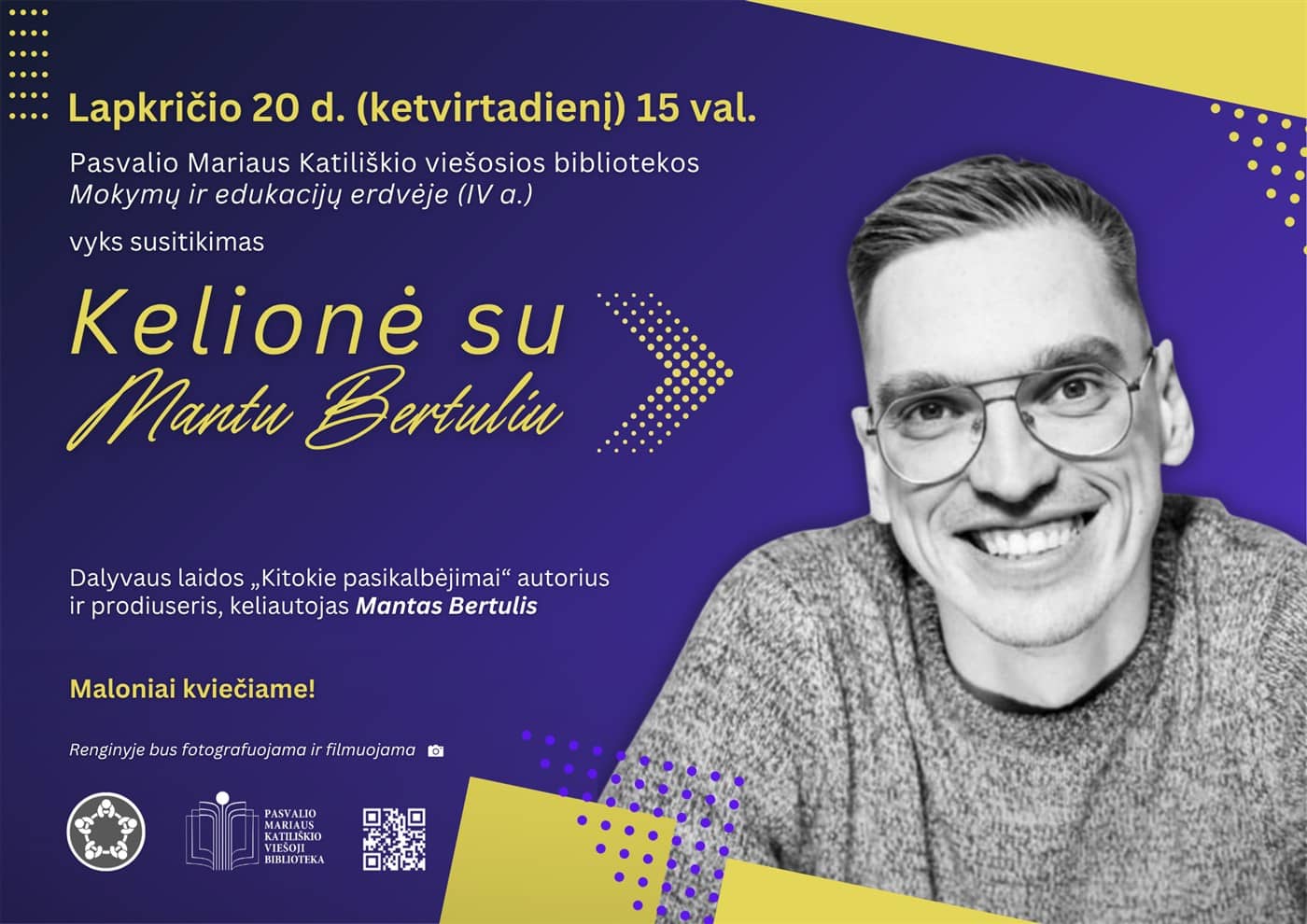 Lapkričio 20 d., ketvirtadienį, 15 val., Pasvalio Mariaus Katiliškio viešosios bibliotekos Mokymų ir edukacijų erdvėje (IV a.) vyks susitikimas „Kelionė su Mantu Bertuliu“.