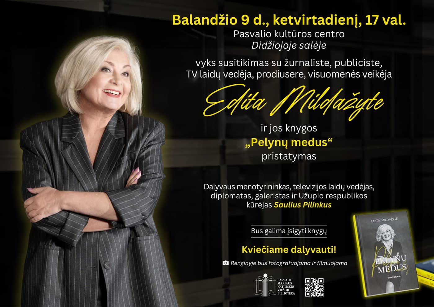 Balandžio 9 d., ketvirtadienį, 17 val., Pasvalio kultūros centro Didžiojoje salėje vyks susitikimas su žurnaliste, publiciste, TV laidų vedėja, prodiusere, visuomenės veikėja Edita Mildažyte ir jos knygos „Pelynų medus“ pristatymas.