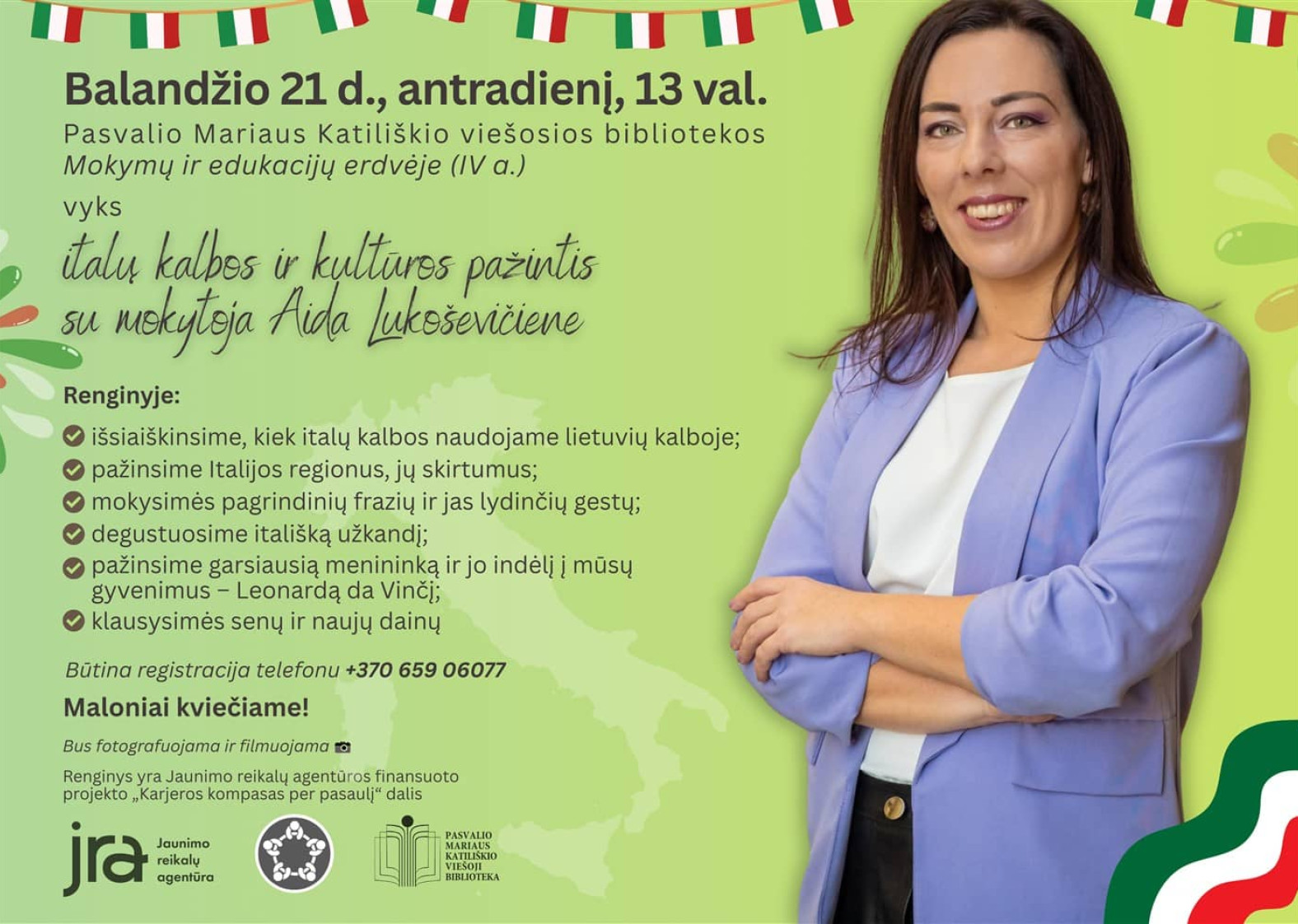 Balandžio 21 d., antradienį, 13 val., Pasvalio Mariaus Katiliškio viešosios bibliotekos Mokymų ir edukacijų erdvėje (IV a.) vyks italų kalbos ir kultūros pažintis su mokytoja Aida Lukoševičiene.
