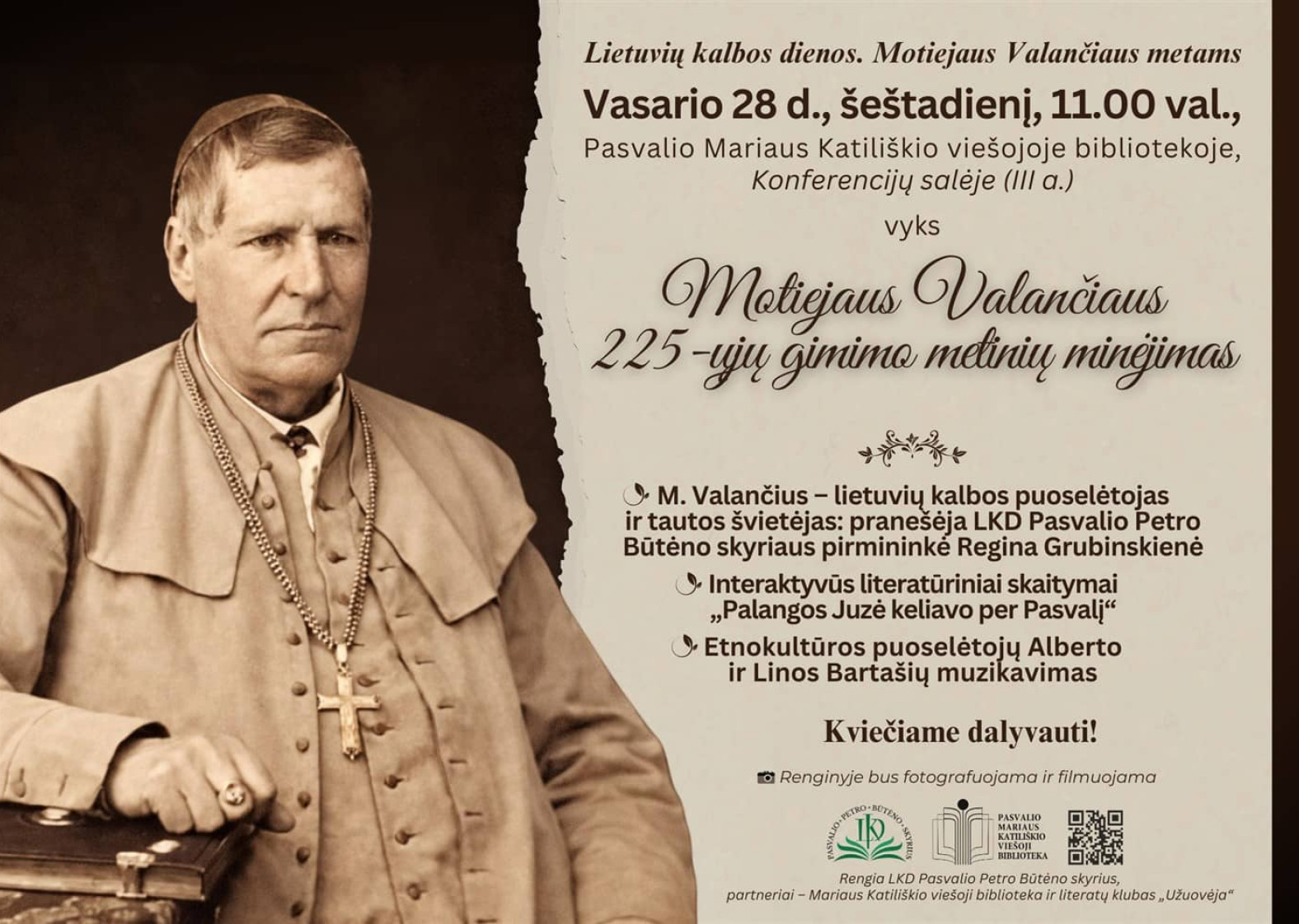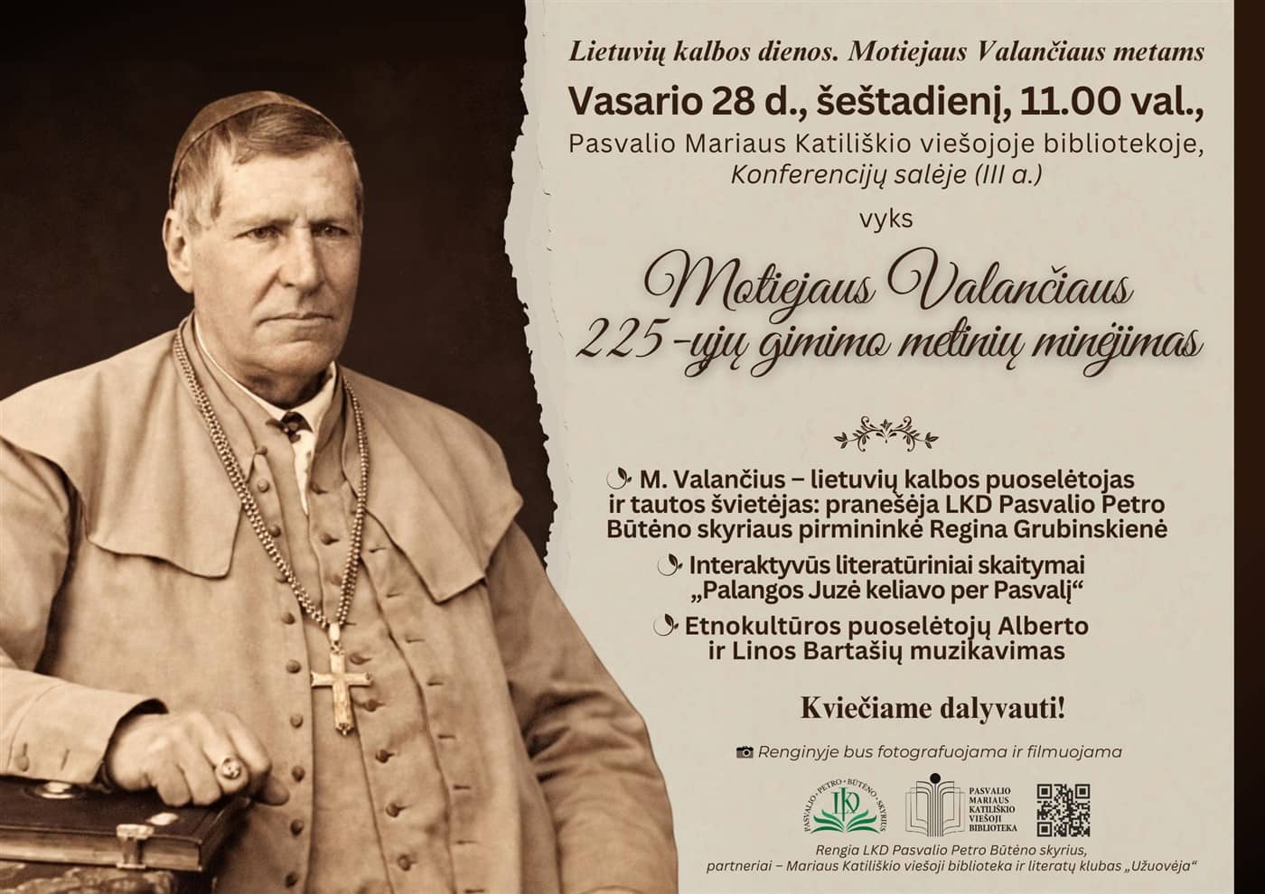 Vasario 28 d., šeštadienį, 11.00 val., Pasvalio Mariaus Katiliškio viešosios bibliotekos Konferencijų salėje (III a.) vyks Motiejaus Valančiaus 225-ųjų gimimo metinių minėjimas.