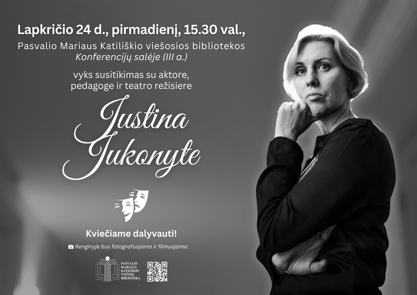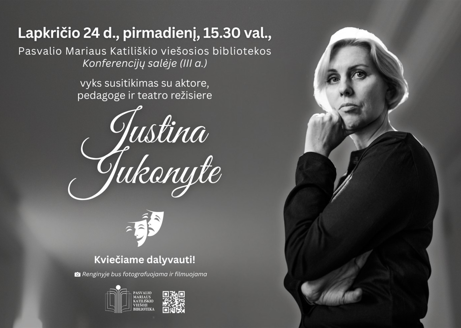 Lapkričio 24 d., pirmadienį, 15.30 val., Pasvalio Mariaus Katiliškio viešosios bibliotekos Konferencijų salėje (III a.) vyks susitikimas su aktore, pedagoge, ir teatro režisiere Justina Jukonyte.