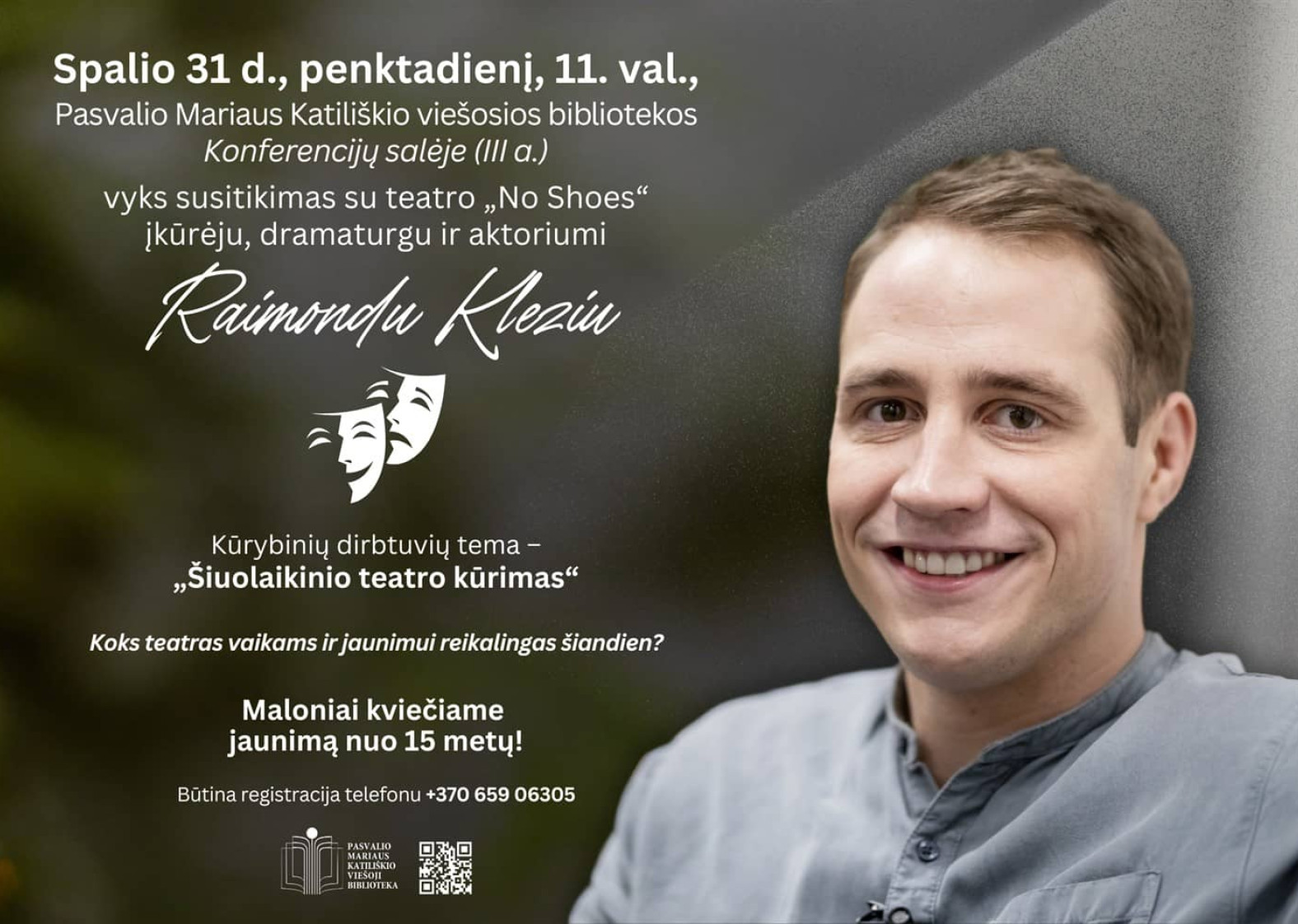 Spalio 31 d., penktadienį, 11. val., Pasvalio Mariaus Katiliškio viešosios bibliotekos Konferencijų salėje (III a.) vyks susitikimas su teatro „No Shoes“ įkūrėju, dramaturgu ir aktoriumi Raimondu Kleziu.