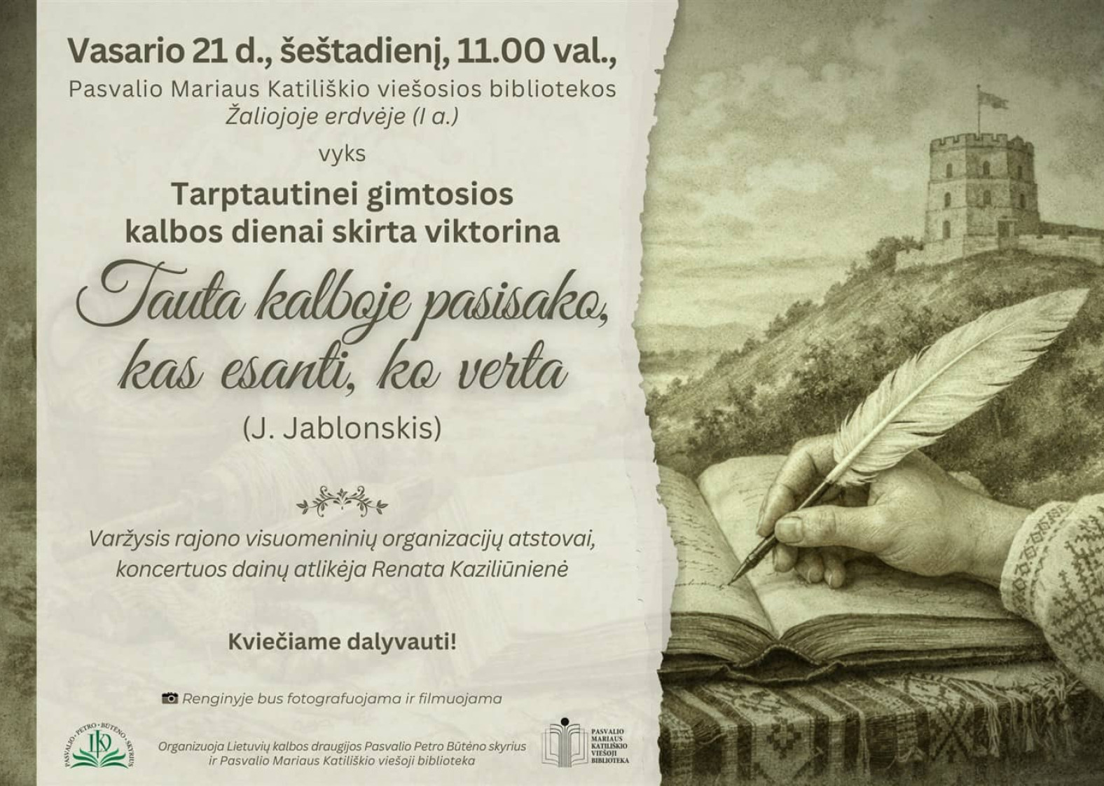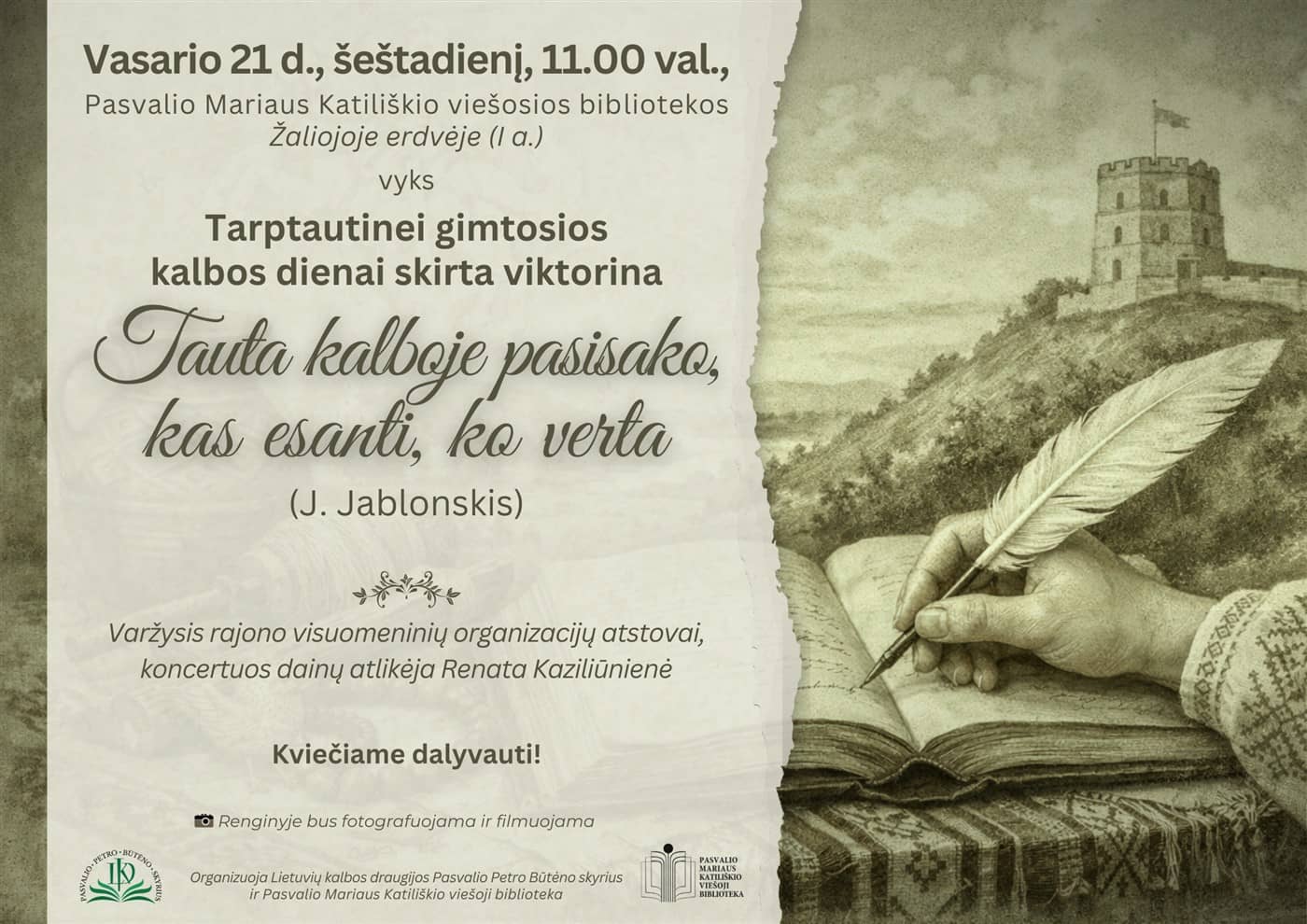 Vasario 21 d., šeštadienį, 11.00 val., Pasvalio Mariaus Katiliškio viešosios bibliotekos Žaliojoje erdvėje (I a.) vyks Tarptautinei gimtosios kalbos dienai skirta viktorina „Tauta kalboje pasisako, kas esanti, ko verta“ (J. Jablonskis).