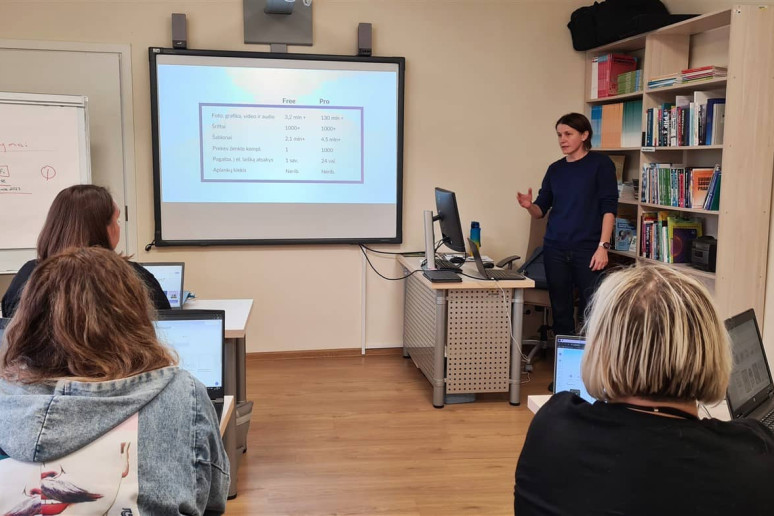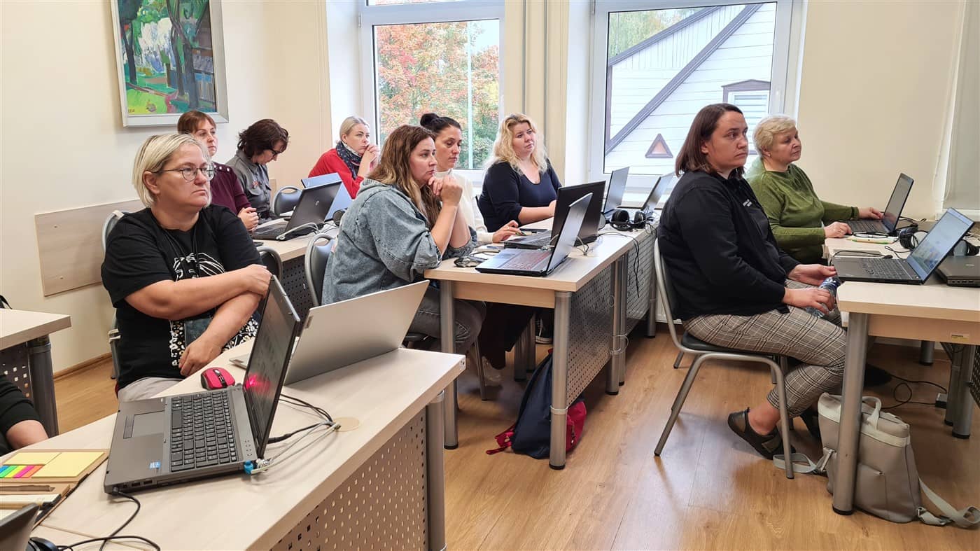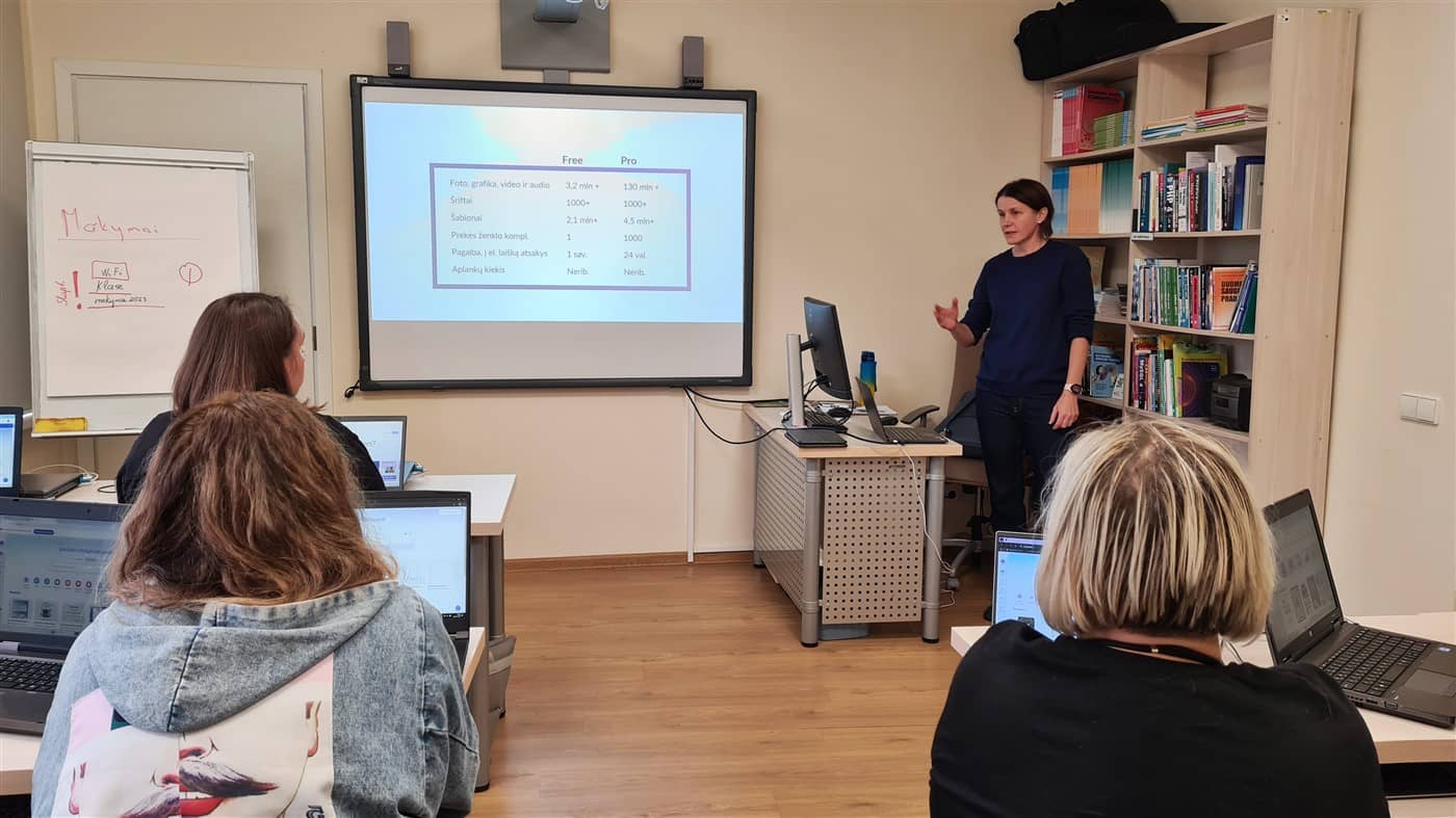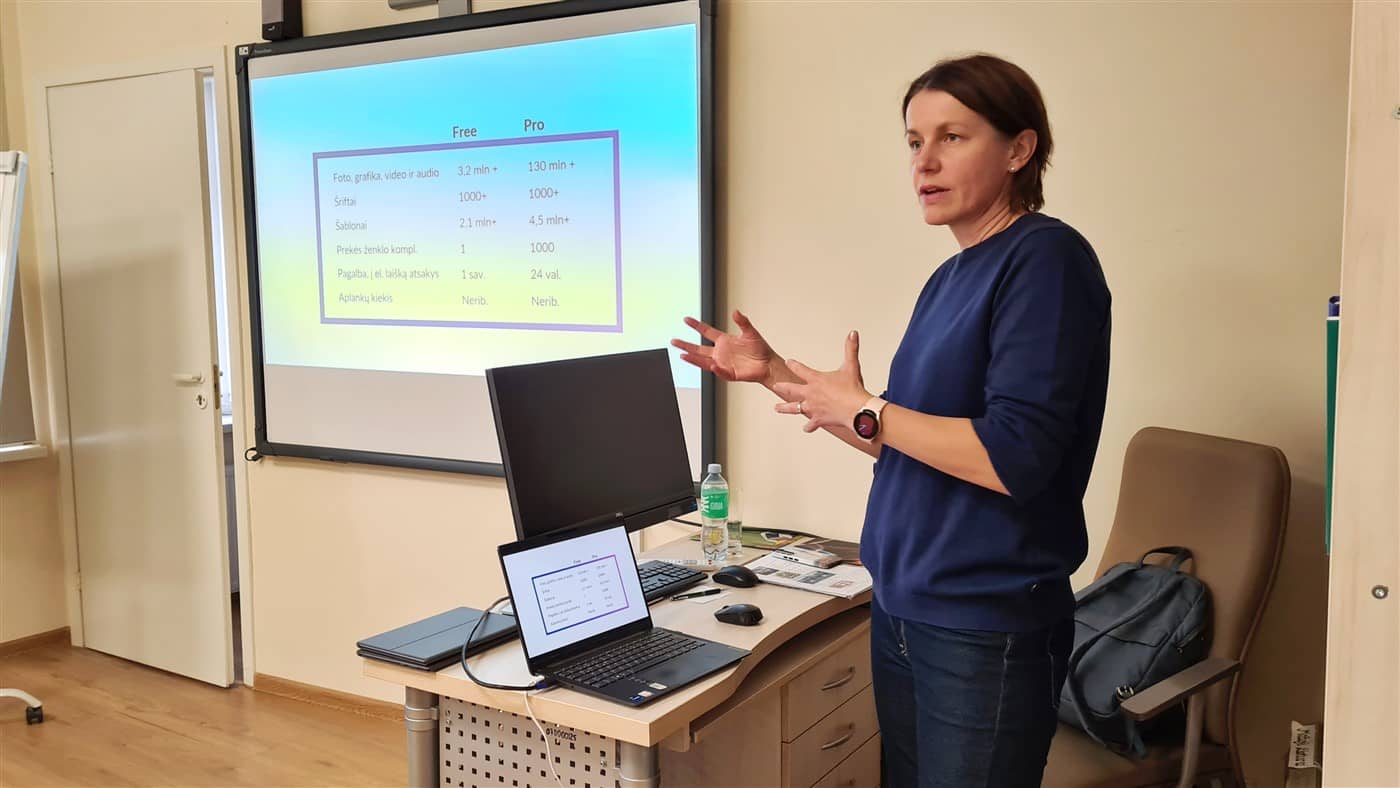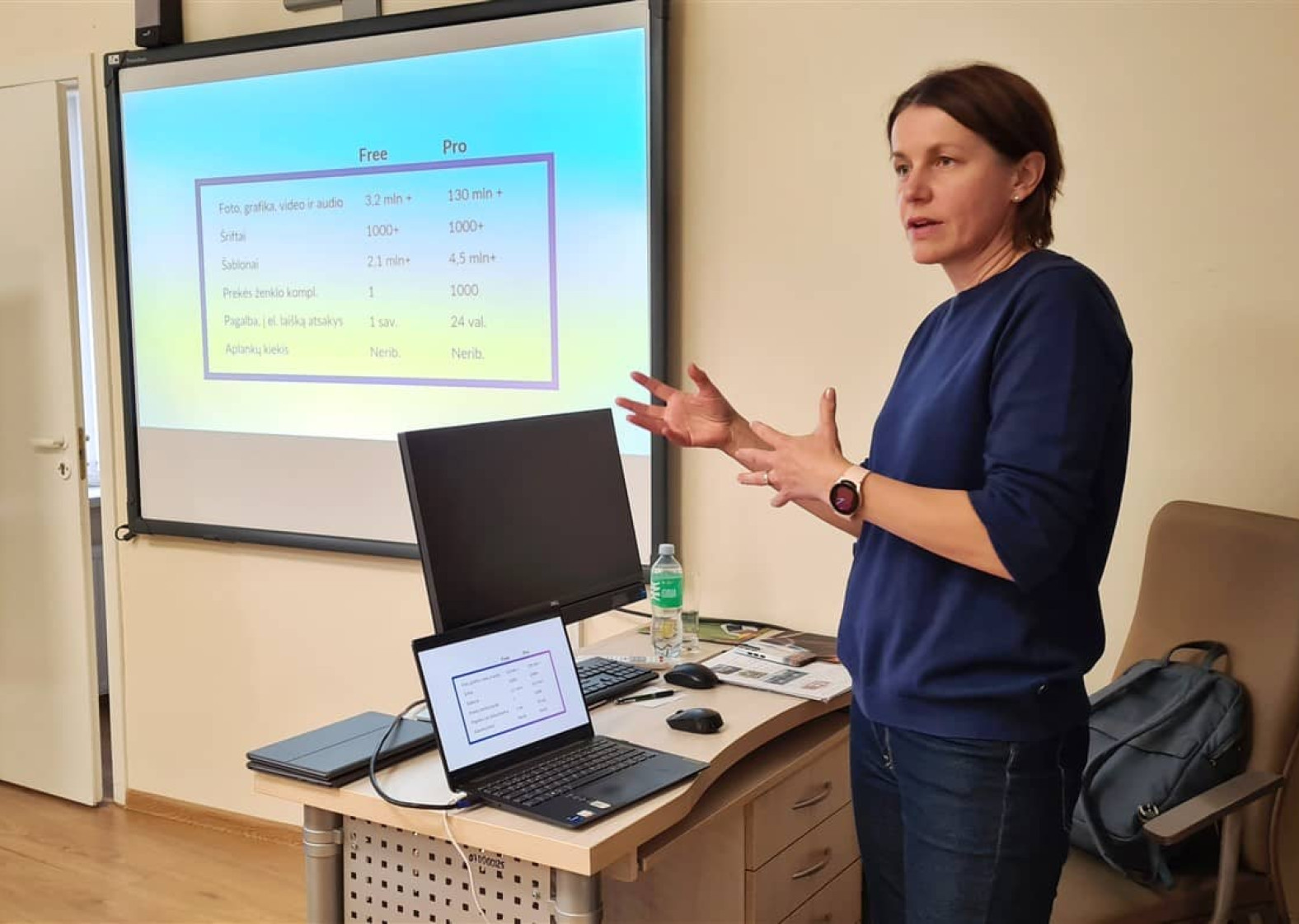 Lektorė supažindino dalyves su „Canva“ programos pagrindais, pristatė jos privalumus ir praktiškai parodė, kaip kurti patrauklius plakatus, skrajutes bei kitus vizualinius kūrinius. Mokymuose dalyvės turėjo galimybę išbandyti įvairias dizaino priemones, gauti naudingų patarimų ir pasisemti kūrybinių idėjų, kurias galės pritaikyti savo veikloje.