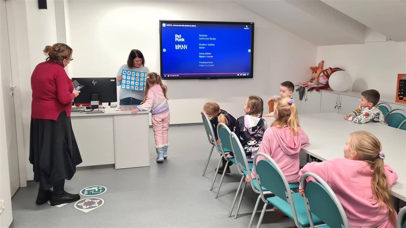 Priešmokyklinukai žiūrėjo animacinį filmuką „Animuota lietuviška abėcėlė“, mokėsi jungti skiemenis į žodžius ir skaitė.