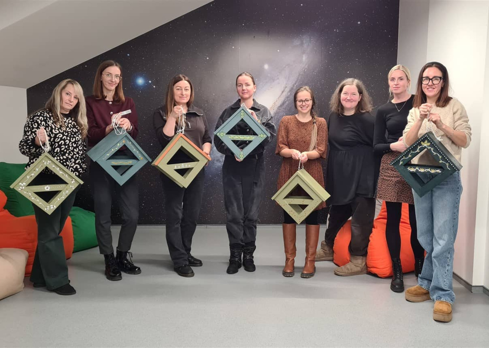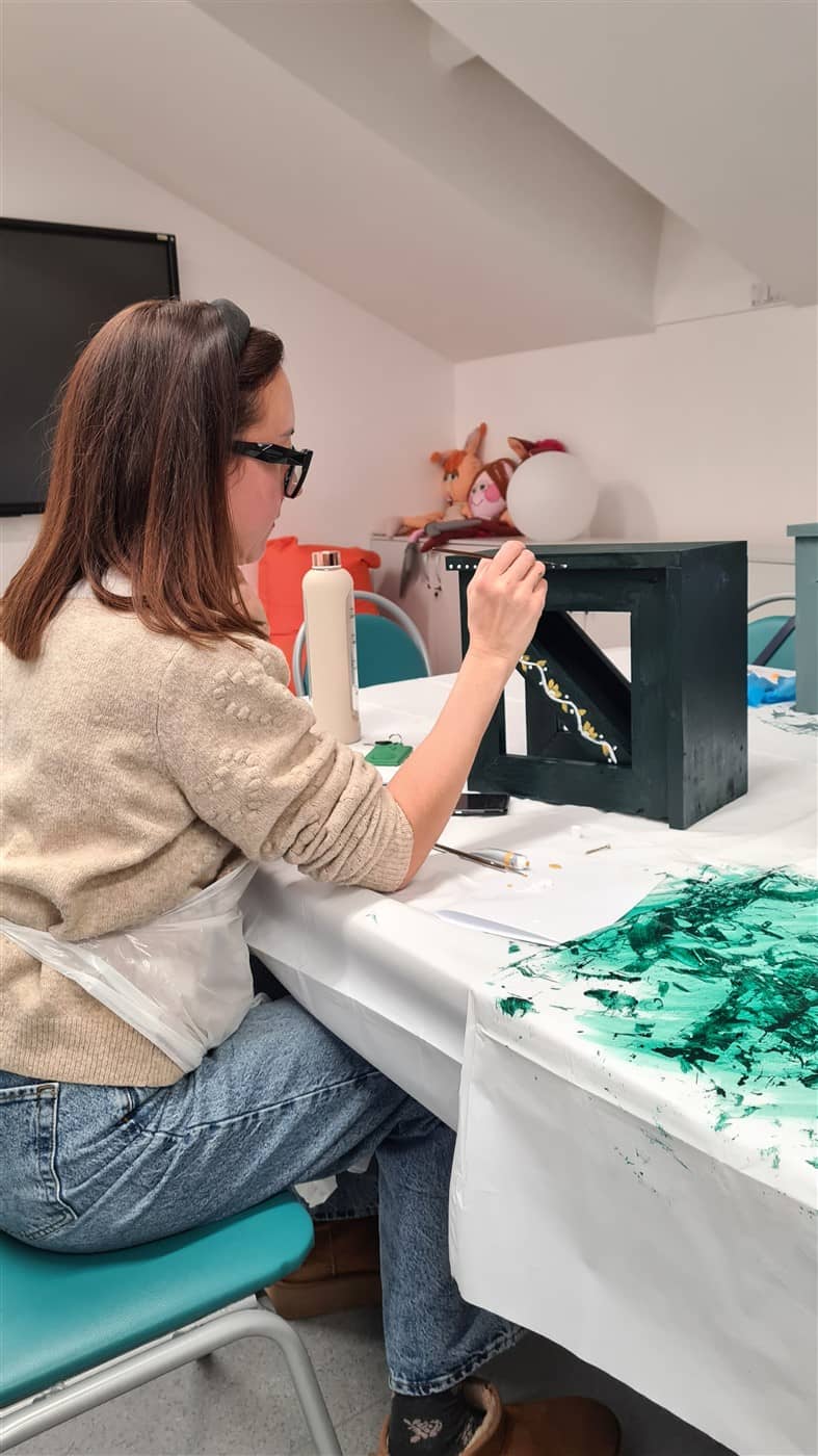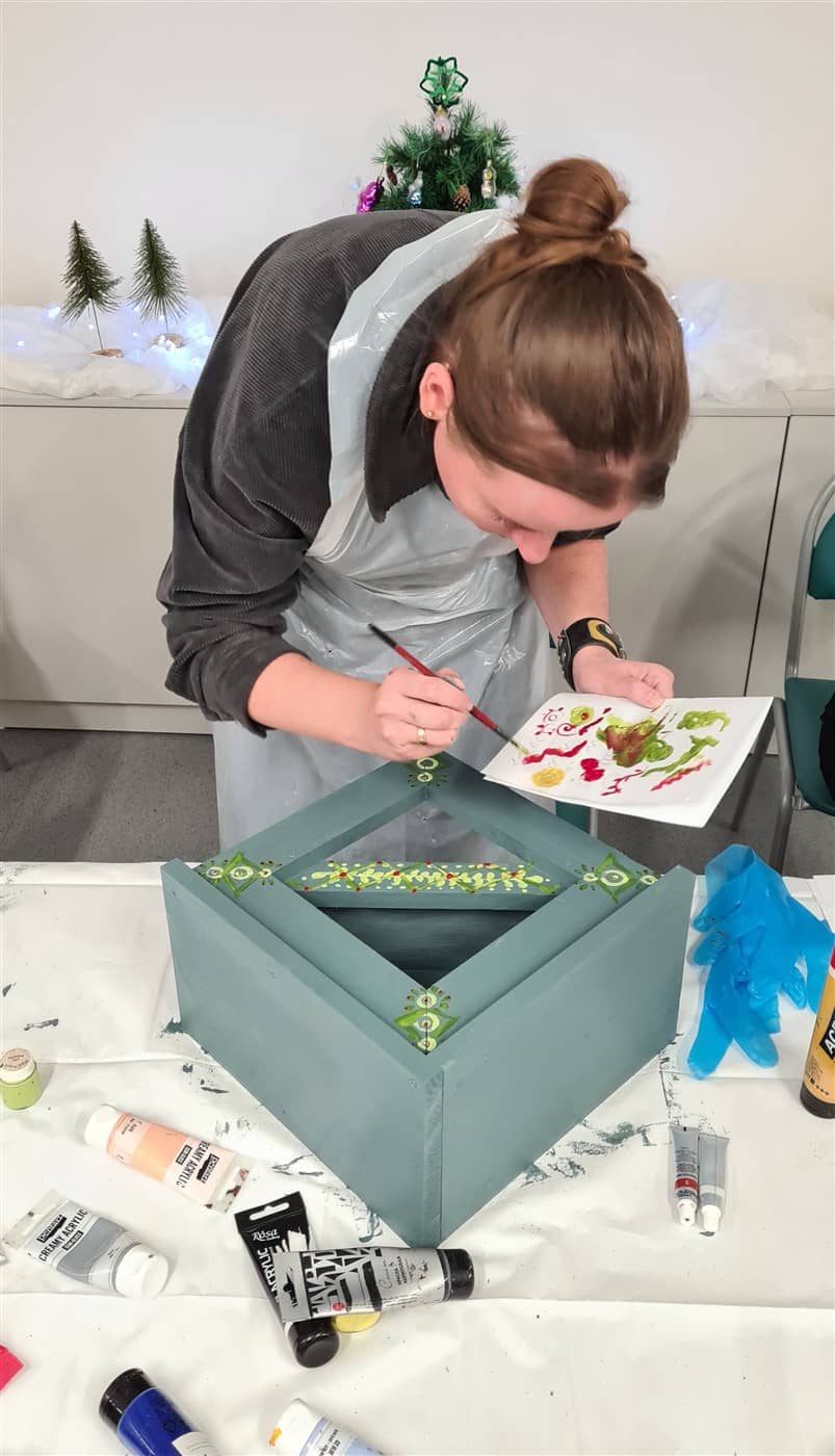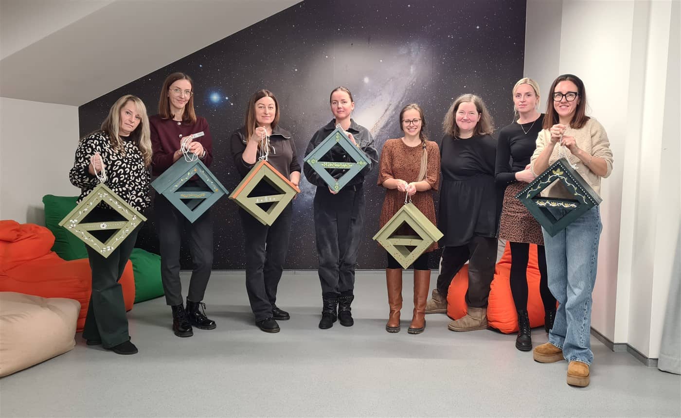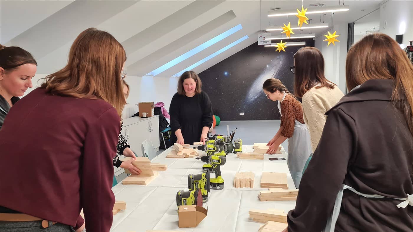 Edukatorė susirinkusiąsias supažindino su naudojamais įrankiais ir parodė, kaip sujungti atskiras medienos ruošinio dalis, jas sutvirtinti ir suformuoti lesyklėlės konstrukciją. Kai lesyklėlės buvo surinktos, dalyvės jas dažė savo pasirinktomis spalvomis. Nudžiuvus dažams, kiekviena dekoravo lesyklėlę akriliniais dažais, kurdama savitą raštą ir detales. Taip buvo sukurti unikalūs darbai, atspindintys kiekvienos dalyvės individualų stilių.