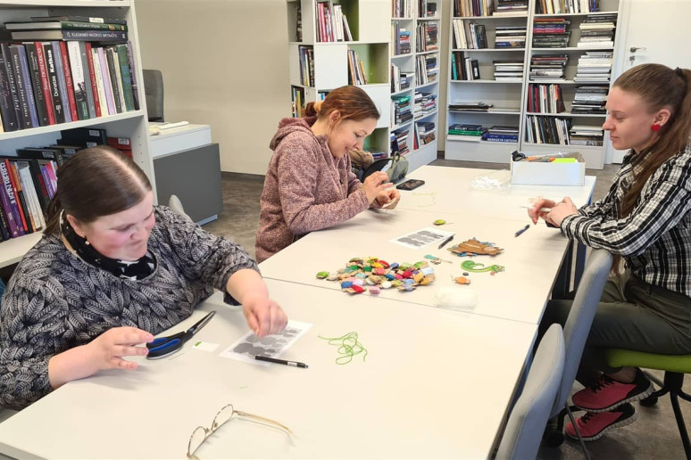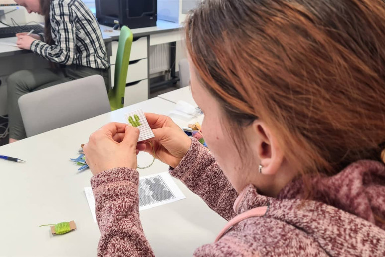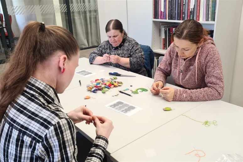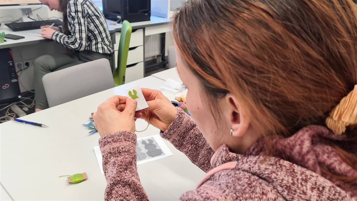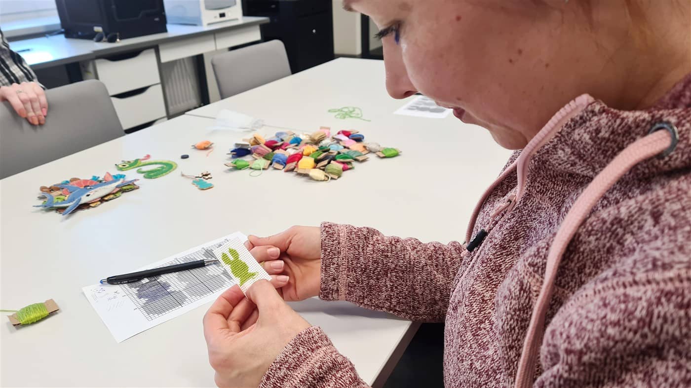 Edukatorė supažindino dalyves su siuvinėjimo pagrindais ir pakvietė praktiškai išbandyti šią techniką. Susirinkusiosios kūrė velykinę dekoraciją – siuvinėtą kiškį ant plastikinės kanvos.