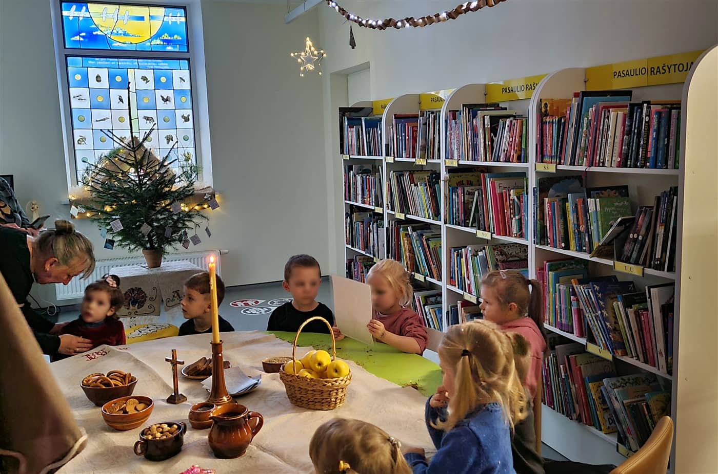 Iš pradžių vyko trumpas pokalbis apie Kalėdas, vaikai noriai atsakinėjo į darbuotojos Lijanos užduodamus klausimus. Vystant pokalbį ir kalbant apie senolių tradicijas, bibliotekininkė Lijana ir Dalia, pasitelkdamos vaizdines priemones ir vaidybos elementus, dalyviams pristatė Kūčių papročius ir tradicijas. Darbuotojos su susirinkusiais ruošė Kūčių stalą – ant jo paskleidė ryšulėlį šieno, tuomet apdengė stalą balta staltiese, padėjo kryželį, lėkštelę su kalėdaičiais, uždegė žvakę. Palaipsniui stalą užpildė pagrindiniai šios šventės patiekalai.