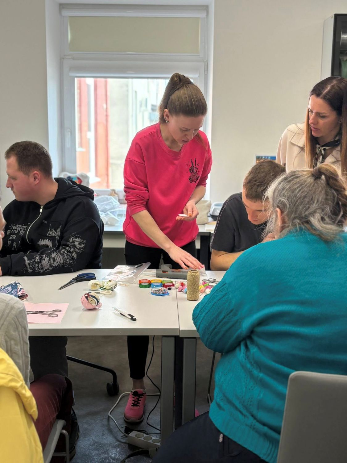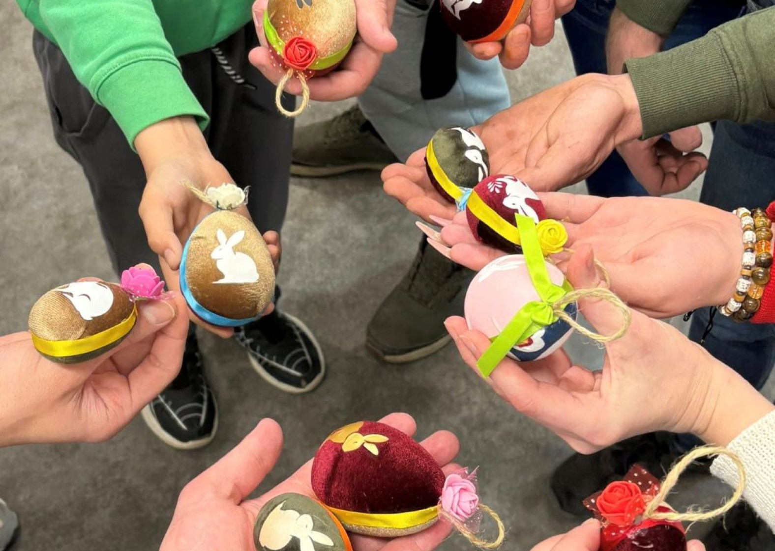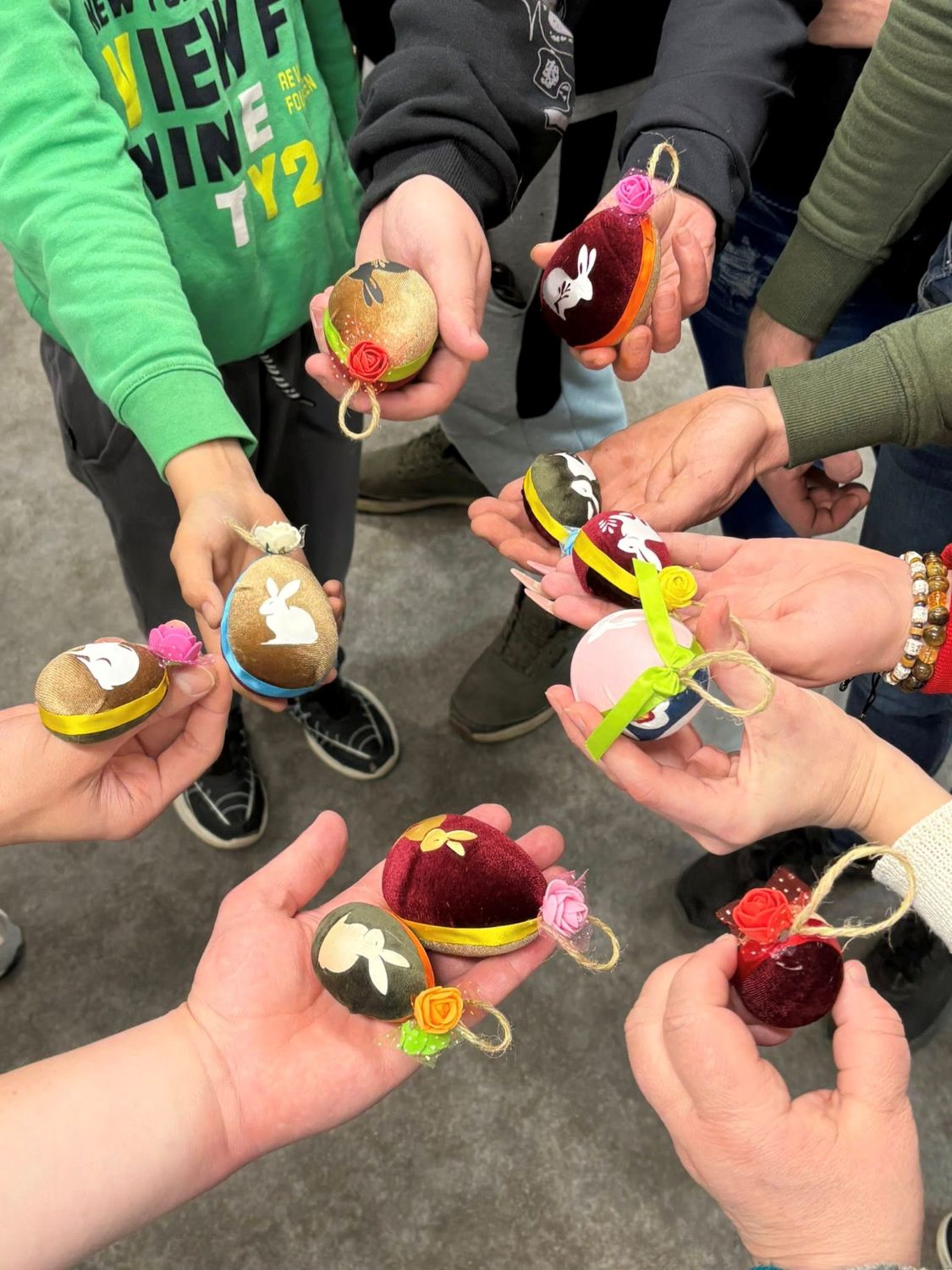Dirbtuvėse jie dekoravo putplasčio kiaušinius, naudodami savo atsineštas medžiagas ir paruoštas priemones. Ant stalų netrūko spalvų, audinių ir kaspinų, o kūrybinis procesas visus įtraukė ir suteikė daug gerų emocijų.