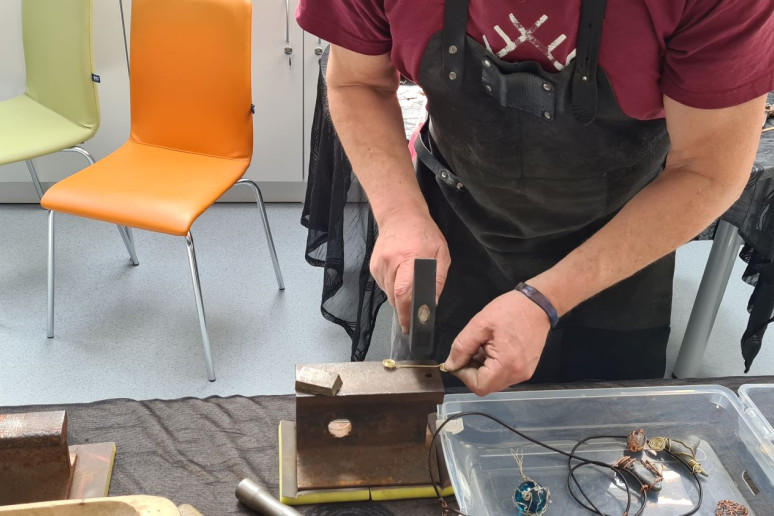 Kūrybinių dirbtuvių metu išmokome naudotis juvelyro naudojamais įrankiais - dilde, įvairių rūšių replėmis, šlifavimo popieriumi, priekalais, poliravimo priemonėmis. Susipažinome su papuošalų gamybos technologijomis, su juvelyro pagalba patys kūrėme pasirinktus papuošalus.