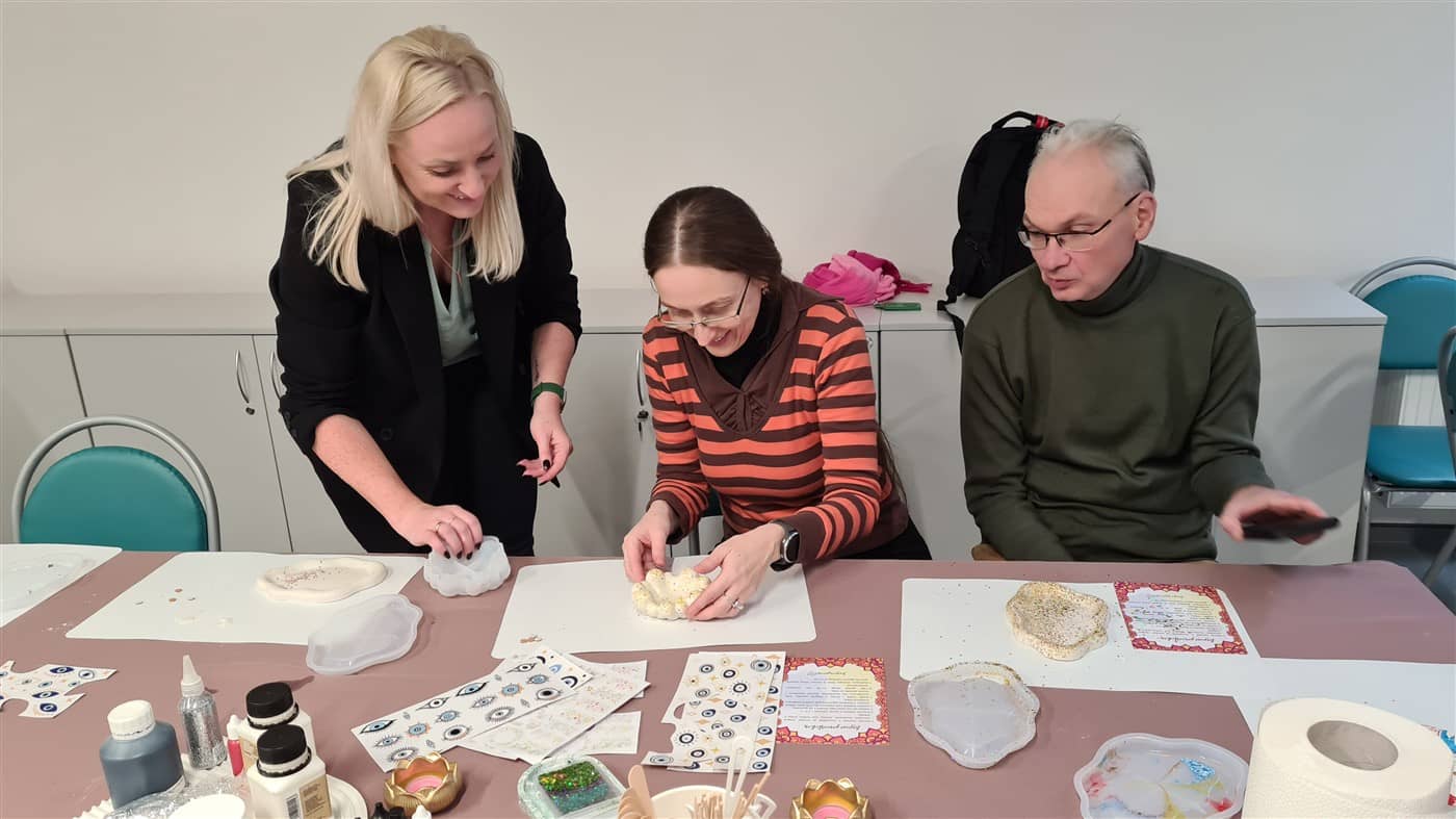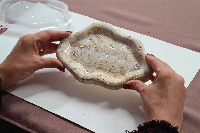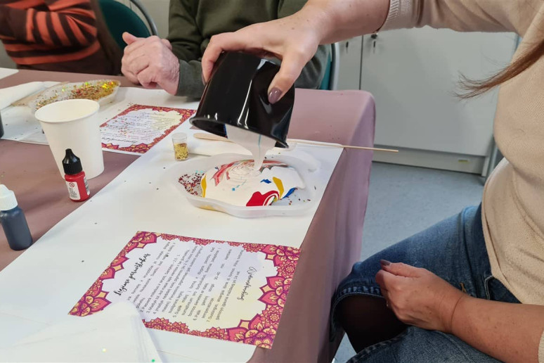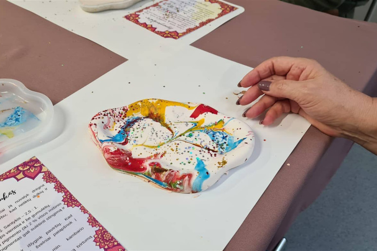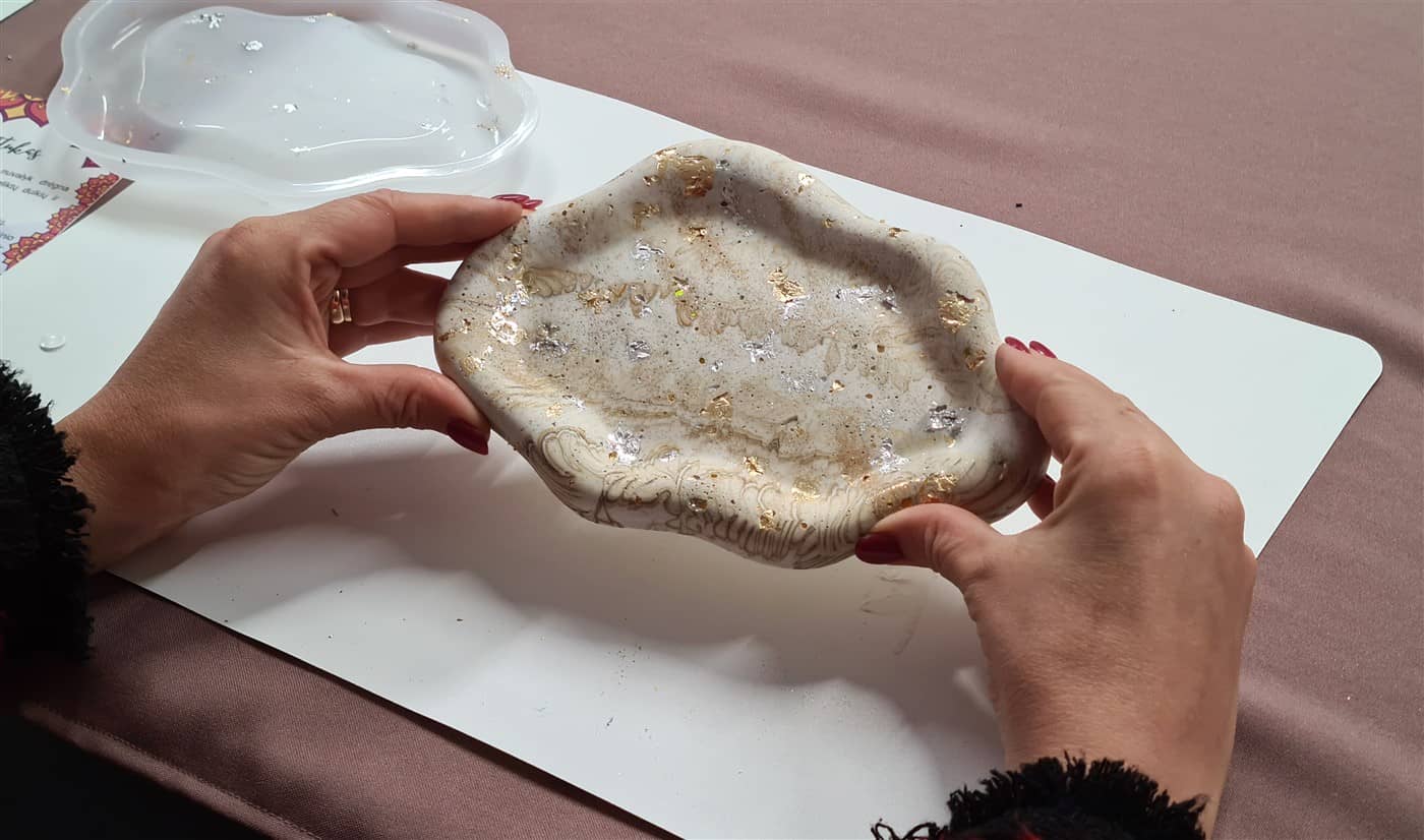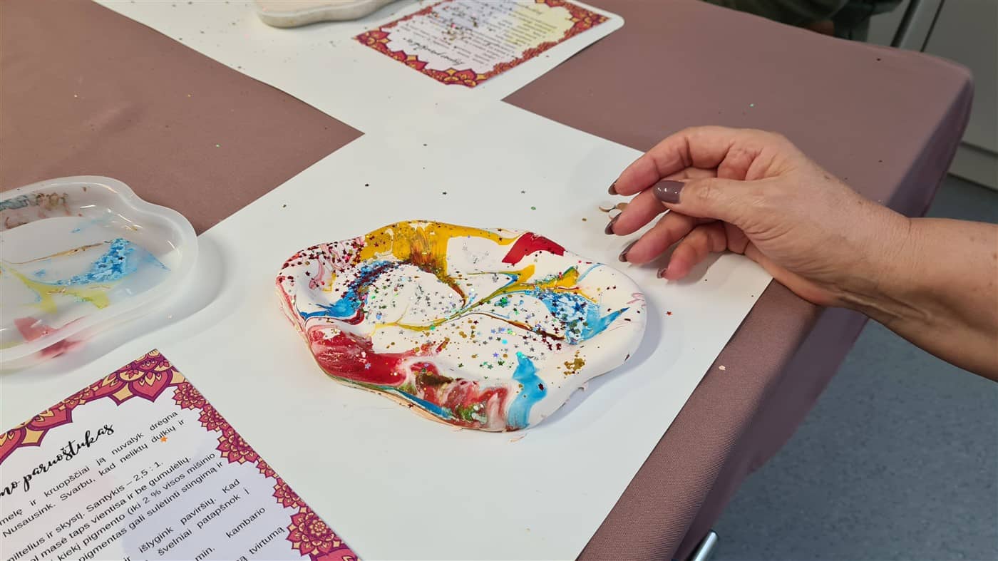 Edukatorė dalyvius supažindino su aplinkai draugiška, netoksiška mineraline derva – medžiaga, leidžiančia kurti stilingus namų dekoro akcentus. Viešnia pristatė įvairius savo išlietų gaminių pavyzdžius ir žingsnis po žingsnio pademonstravo padėkliuko gamybos procesą. Dalyviai ne tik stebėjo, bet ir patys išbandė šią unikalią liejimo techniką: maišė dervą su pasirinktais pigmentais, ant formų barstė blizgučius ir kitus dekoravimo elementus, vėliau supylė masę. Kiekvienas sukūrė po išskirtinį padėkliuką, kuris, tikimės, taps puikiu interjero akcentu jų namuose, miela dovana ar tiesiog primins jaukią popietę.