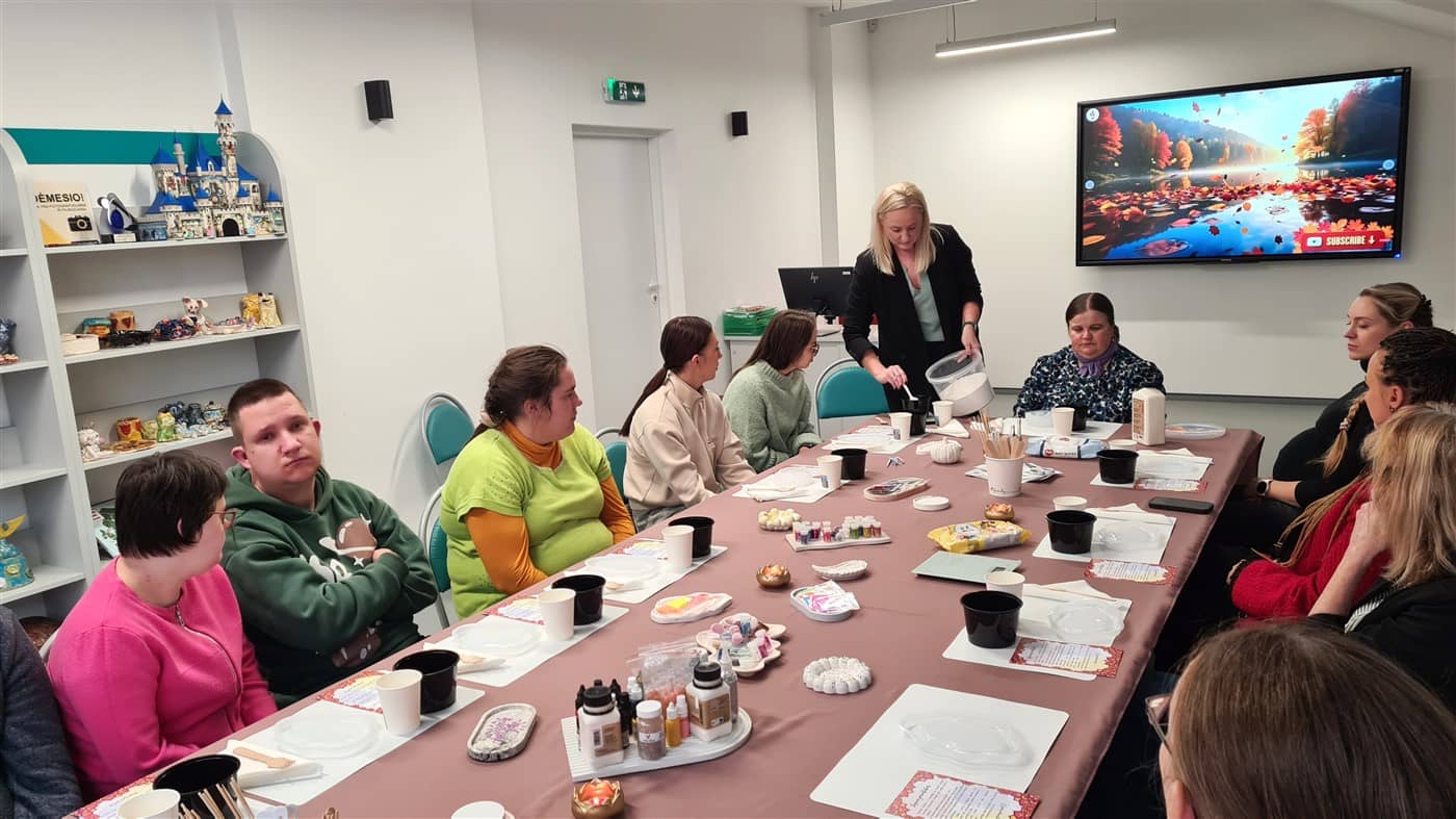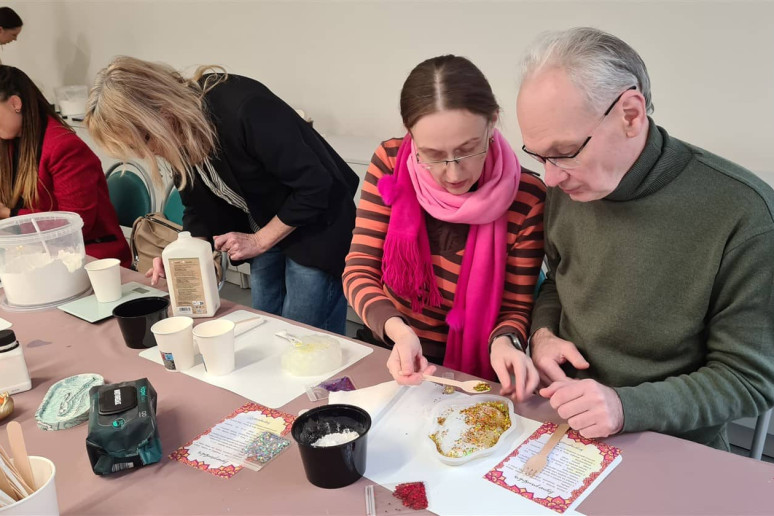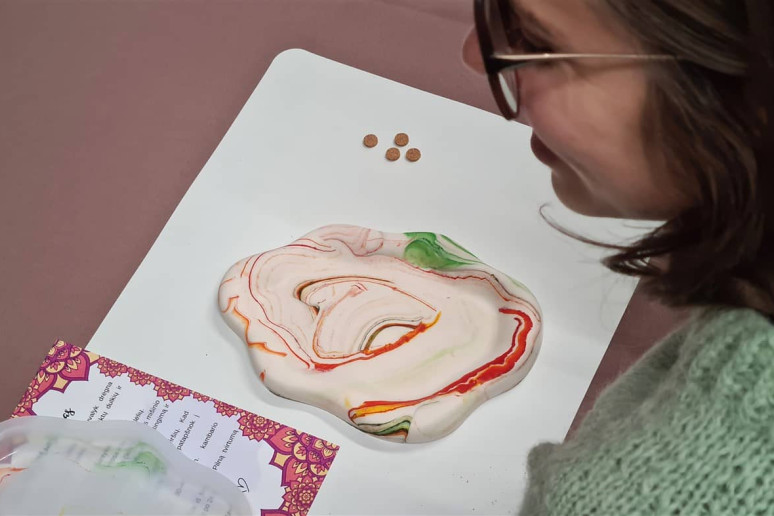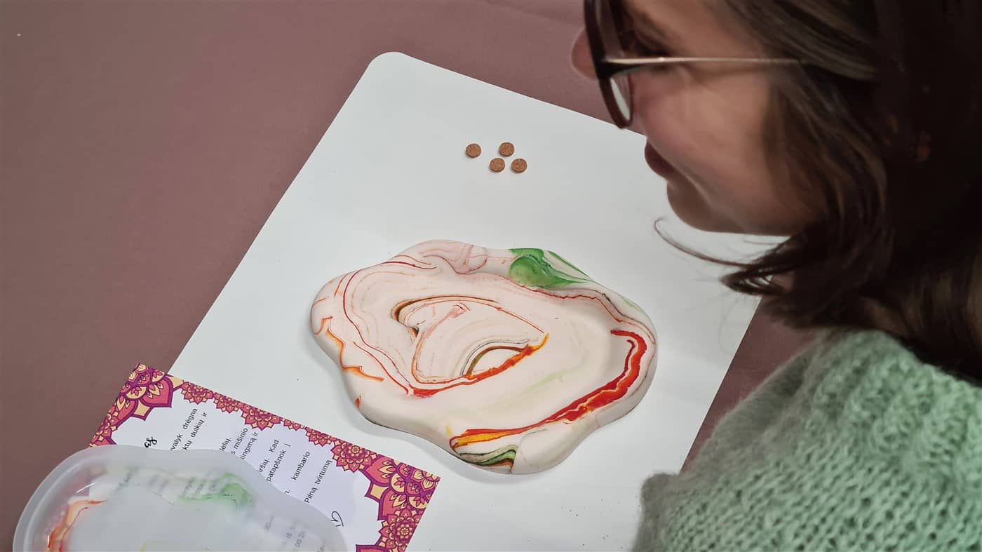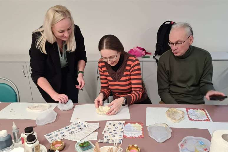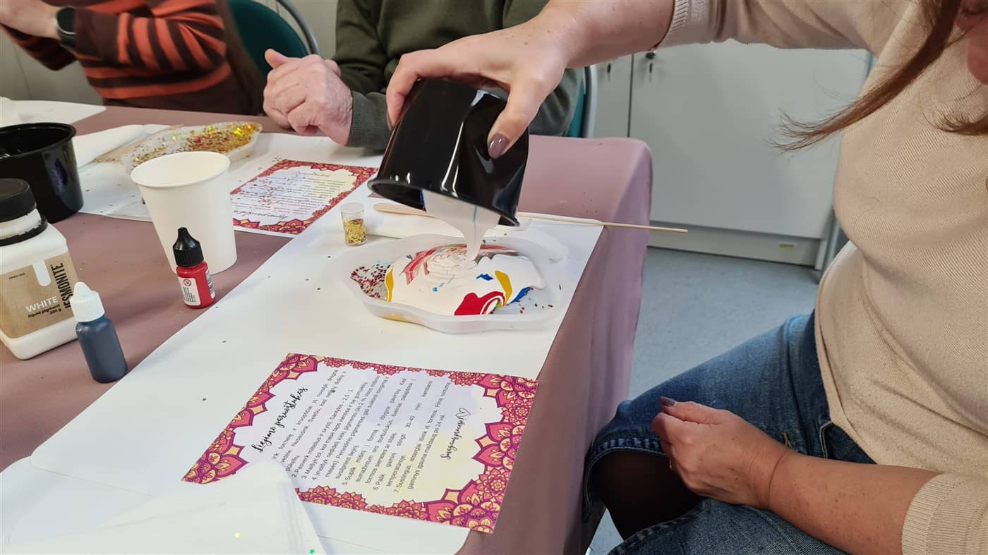 Edukatorė dalyvius supažindino su aplinkai draugiška, netoksiška mineraline derva – medžiaga, leidžiančia kurti stilingus namų dekoro akcentus. Viešnia pristatė įvairius savo išlietų gaminių pavyzdžius ir žingsnis po žingsnio pademonstravo padėkliuko gamybos procesą. Dalyviai ne tik stebėjo, bet ir patys išbandė šią unikalią liejimo techniką: maišė dervą su pasirinktais pigmentais, ant formų barstė blizgučius ir kitus dekoravimo elementus, vėliau supylė masę. Kiekvienas sukūrė po išskirtinį padėkliuką, kuris, tikimės, taps puikiu interjero akcentu jų namuose, miela dovana ar tiesiog primins jaukią popietę.