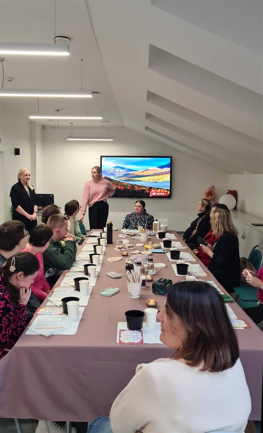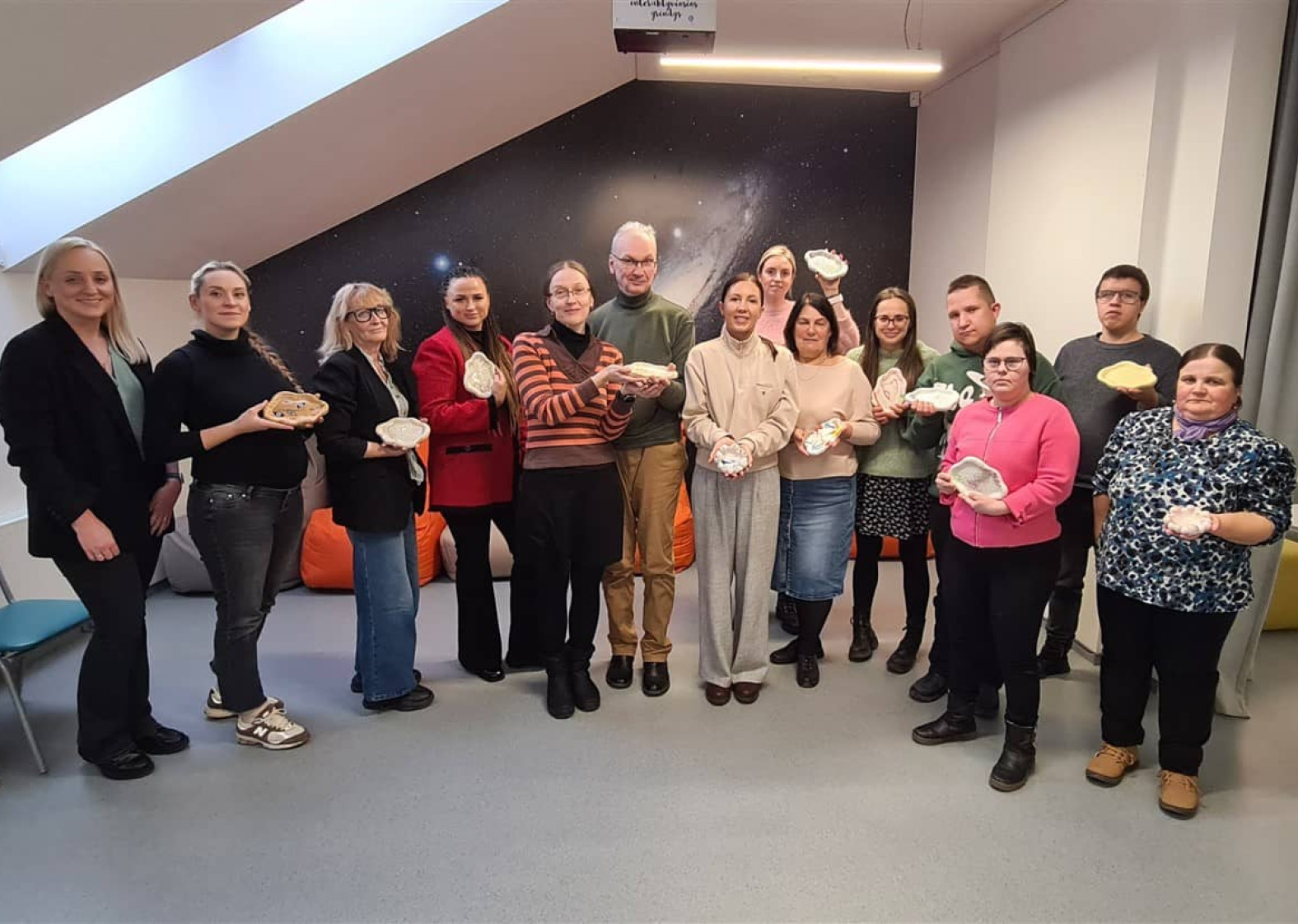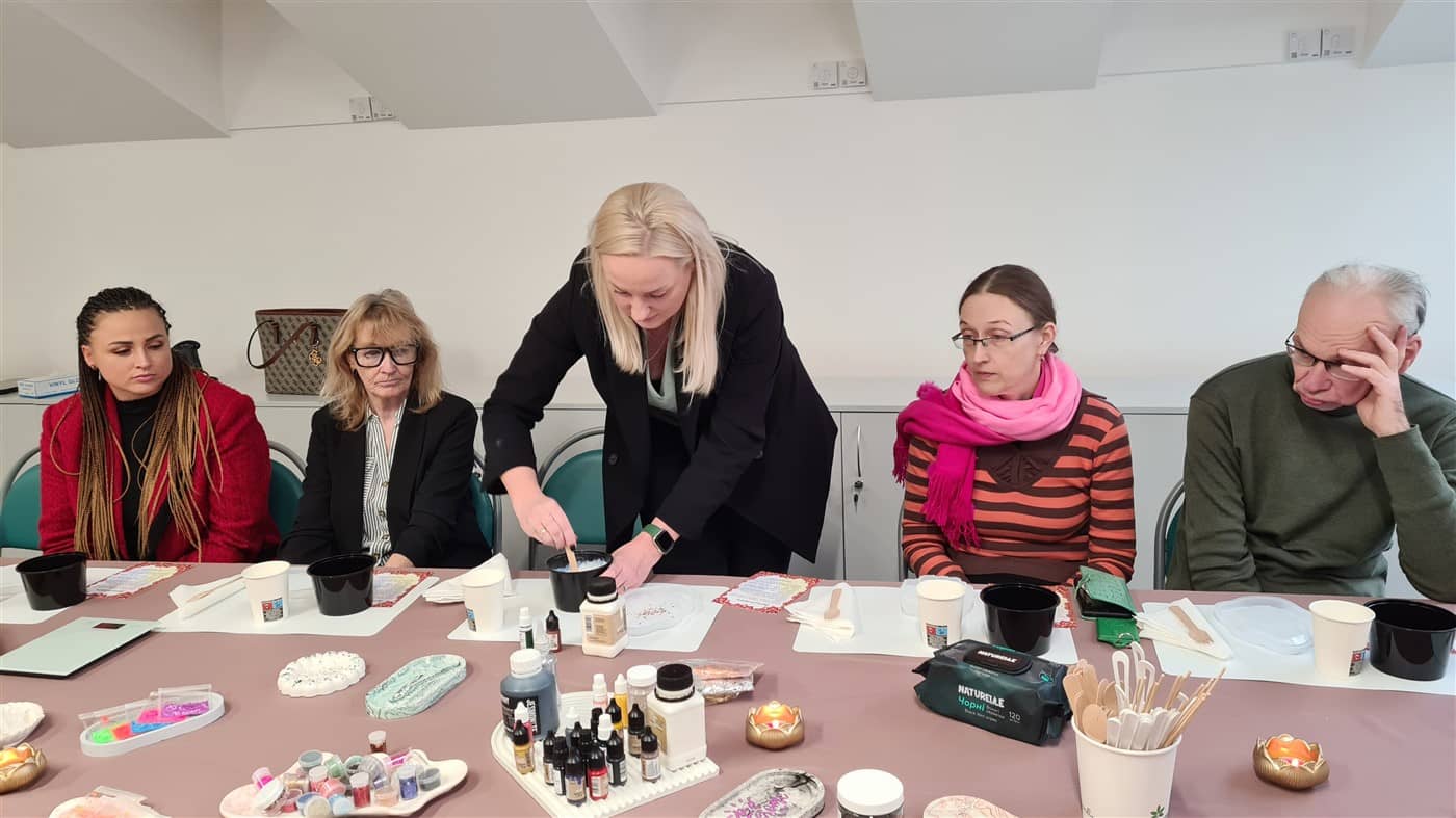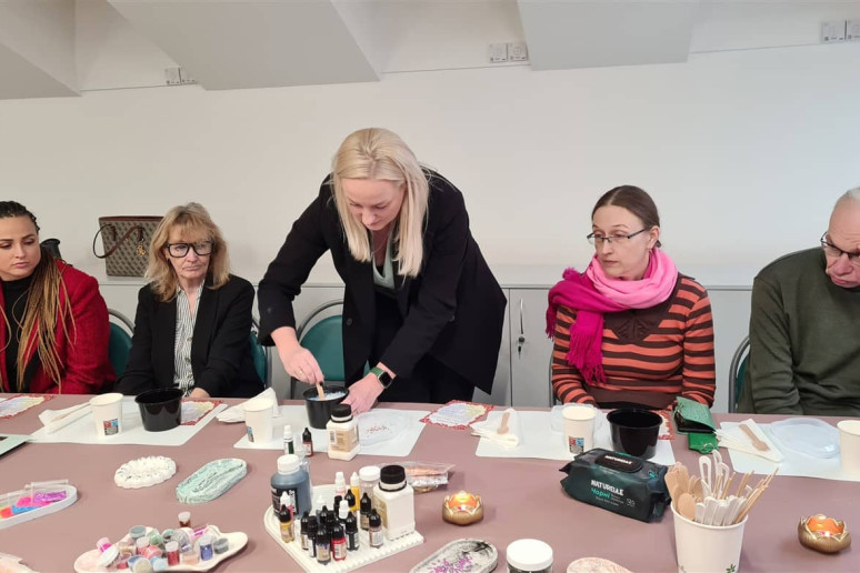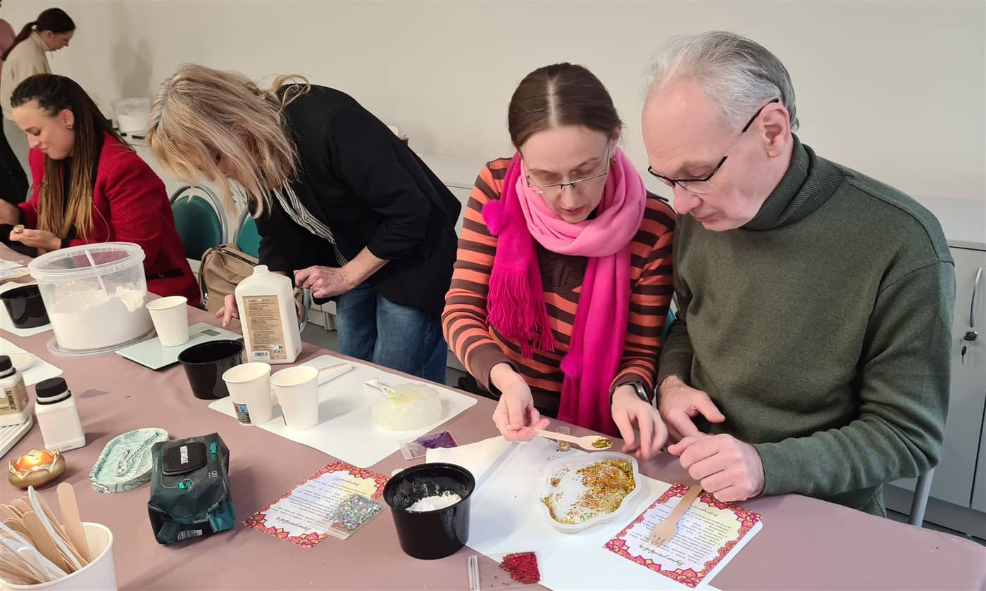 Edukatorė dalyvius supažindino su aplinkai draugiška, netoksiška mineraline derva – medžiaga, leidžiančia kurti stilingus namų dekoro akcentus. Viešnia pristatė įvairius savo išlietų gaminių pavyzdžius ir žingsnis po žingsnio pademonstravo padėkliuko gamybos procesą. Dalyviai ne tik stebėjo, bet ir patys išbandė šią unikalią liejimo techniką: maišė dervą su pasirinktais pigmentais, ant formų barstė blizgučius ir kitus dekoravimo elementus, vėliau supylė masę. Kiekvienas sukūrė po išskirtinį padėkliuką, kuris, tikimės, taps puikiu interjero akcentu jų namuose, miela dovana ar tiesiog primins jaukią popietę.
