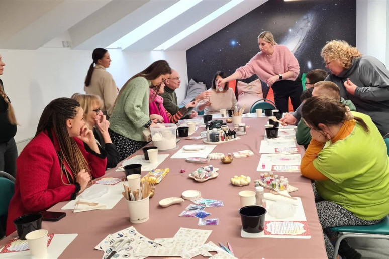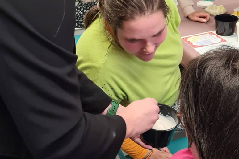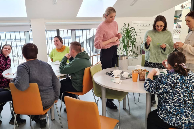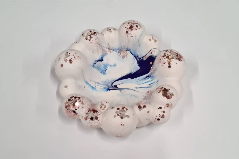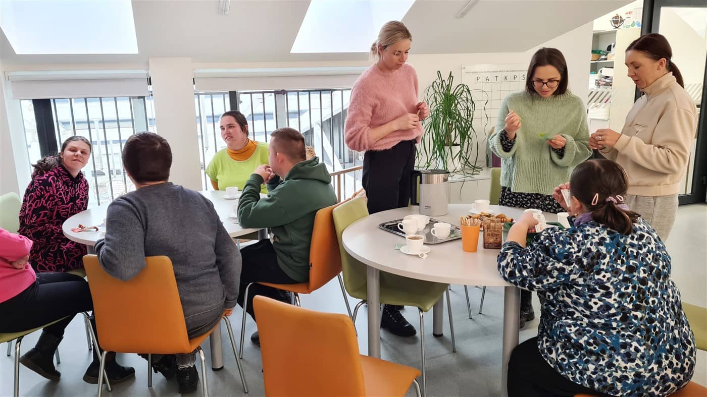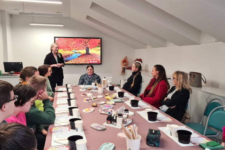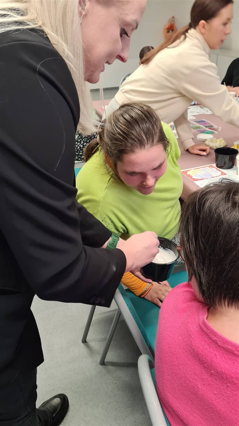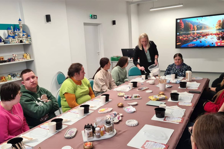 Edukatorė dalyvius supažindino su aplinkai draugiška, netoksiška mineraline derva – medžiaga, leidžiančia kurti stilingus namų dekoro akcentus. Viešnia pristatė įvairius savo išlietų gaminių pavyzdžius ir žingsnis po žingsnio pademonstravo padėkliuko gamybos procesą. Dalyviai ne tik stebėjo, bet ir patys išbandė šią unikalią liejimo techniką: maišė dervą su pasirinktais pigmentais, ant formų barstė blizgučius ir kitus dekoravimo elementus, vėliau supylė masę. Kiekvienas sukūrė po išskirtinį padėkliuką, kuris, tikimės, taps puikiu interjero akcentu jų namuose, miela dovana ar tiesiog primins jaukią popietę.