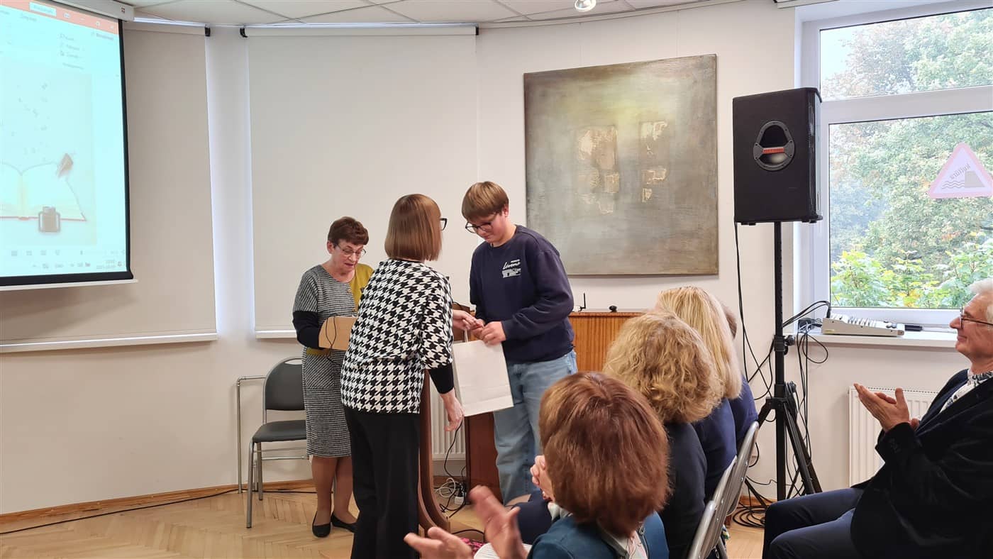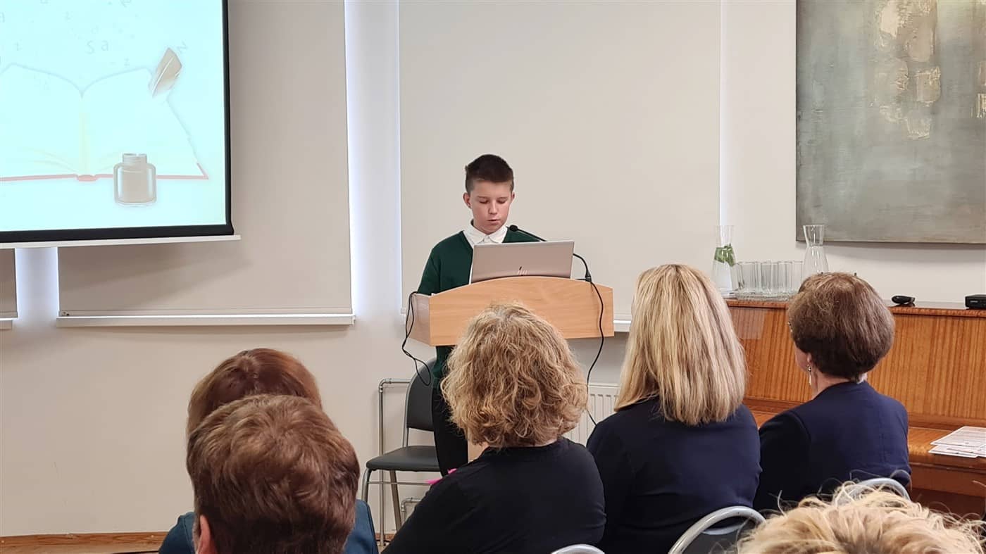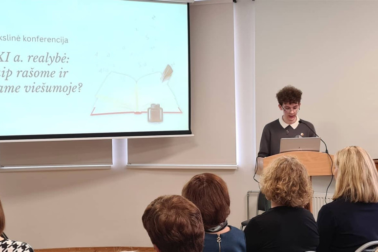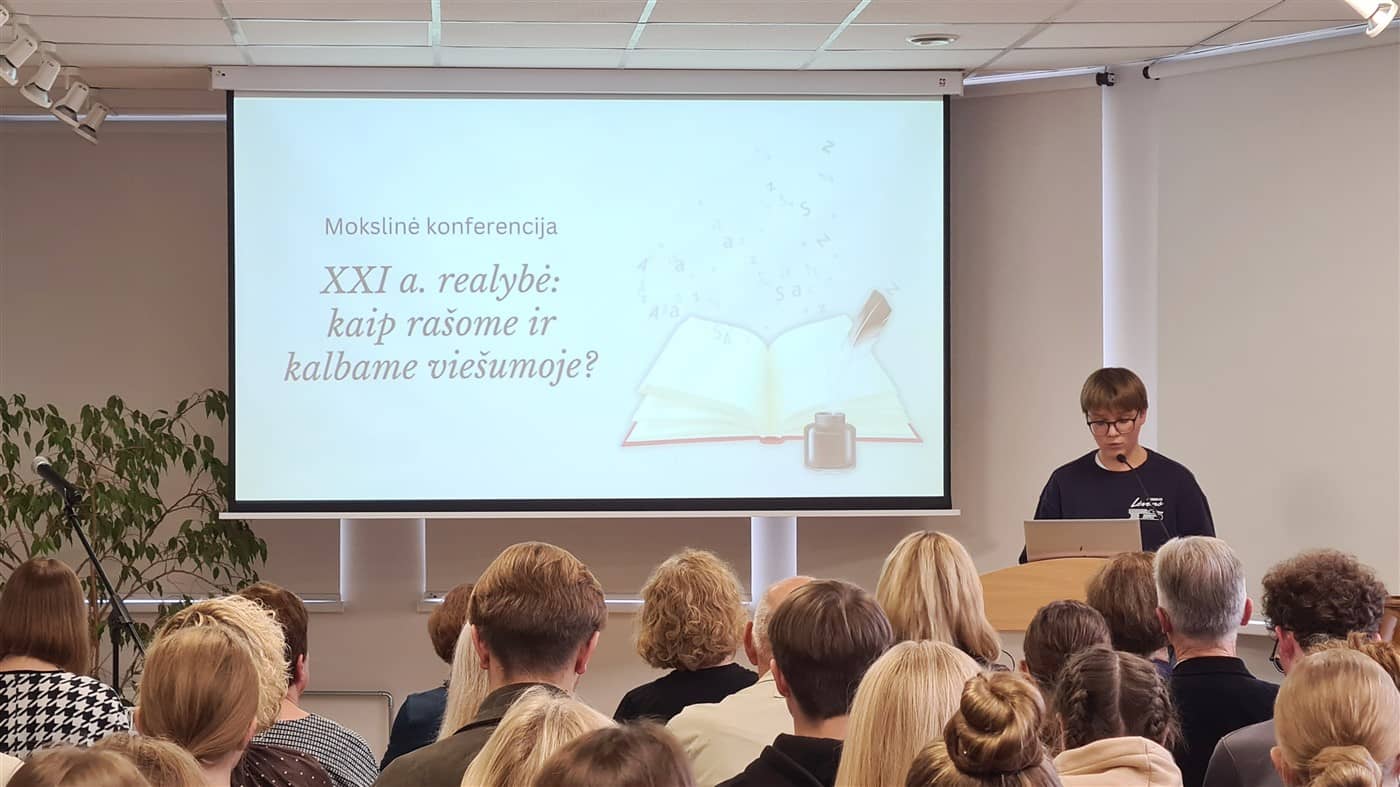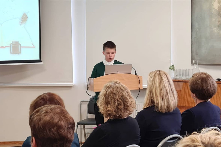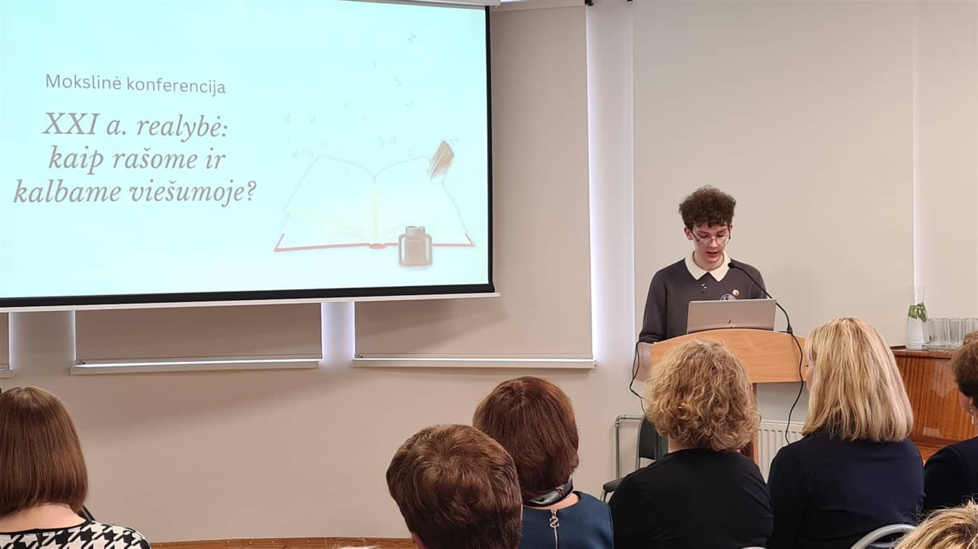 Pirmojoje konferencijos dalyje taip pat vyko minėto konkurso „Viešoji mūsų kalba: sakytinės ir rašytinės formos“ apibendrinimas ir laimėtojų apdovanojimai. Moksleivių darbus apžvelgė Lietuvių kalbos draugijos Pasvalio Petro Būtėno skyriaus narė Laimutė Vaitkevičienė.