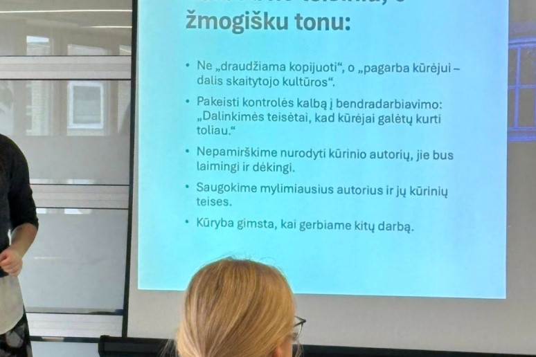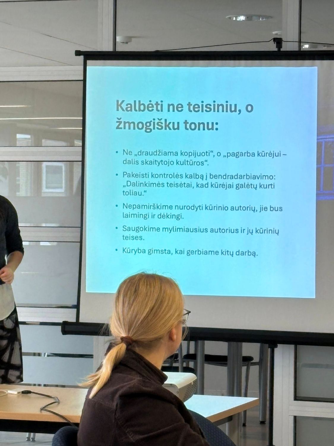 Lektorė Rūta Latinytė pristatė, kaip aiškiai ir kūrybiškai komunikuoti autorių teisių temas bibliotekose, dalyviai atliko praktines užduotis ir analizavo realias situacijas. Įgytos žinios padės dar veiksmingiau perteikti sudėtingą informaciją mūsų bendruomenei.