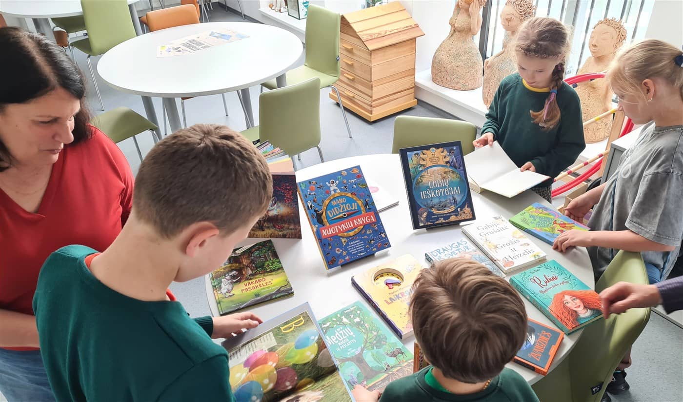 Bibliotekos darbuotojos Gintarė ir Rasa paruošė susirinkusiems pačias naujausias vaikiškas knygas (Unos Lunės „Lapė Salegna“, Jen Green „Medžių magija ir paslaptys“, Gabriella Santini „Lobių ieškotojai. 12 neįtikėtinų istorijų apie prarastus lobius“, Camilla De La Bédoyère „Mano didžioji nuotykių knyga“, Christine Nostlinger „Draugas iš svetur“, Kira Gembri „Rubinė. Magiškosios įlankos sergėtojai“, Lois Lowry „Suskaičiuotos žvaigždės“, Gabijos Grušaitės „Grožis ir Heizelis“, Tomo Dirgėlos „Valerijonas ir Jonas gelbėja pasaulį“, Carl-Johan Forssén Ehrlin „Triušelis, kuris norėjo užmigti“, Mariaus Marcinkevičiaus „Laikrodukas. Pažink laiką“, Vytauto Račicko „Berniukas ieško tėčio“ ir kt.), iš kurių patys dalyviai galėjo rinktis ir jų pasirinktas trumpas ištraukas skaityti savo draugams.