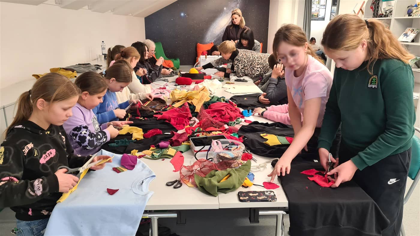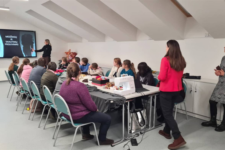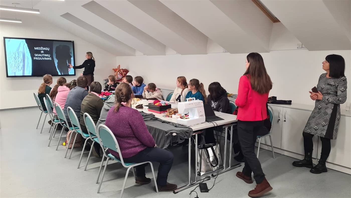 Dirbtuves vedė Roberta Vaidotienė, kuri dalyviams padėjo kurti originalias kompozicijas iš geltonos, žalios ir raudonos spalvų medžiagos atraižų, sagų bei kitų puošybos elementų. Norimus papuošimus dalyviai kūrė ir patys – nėrė spalvotas juosteles, derino skirtingas detales, o kompozicijas tvirtino siūlų dygsniais. Vėliau, edukatorės padedami, darbai buvo galutinai sutvirtinti siuvimo mašina, apsiuvant kontūrus.