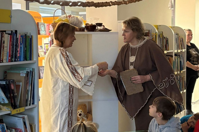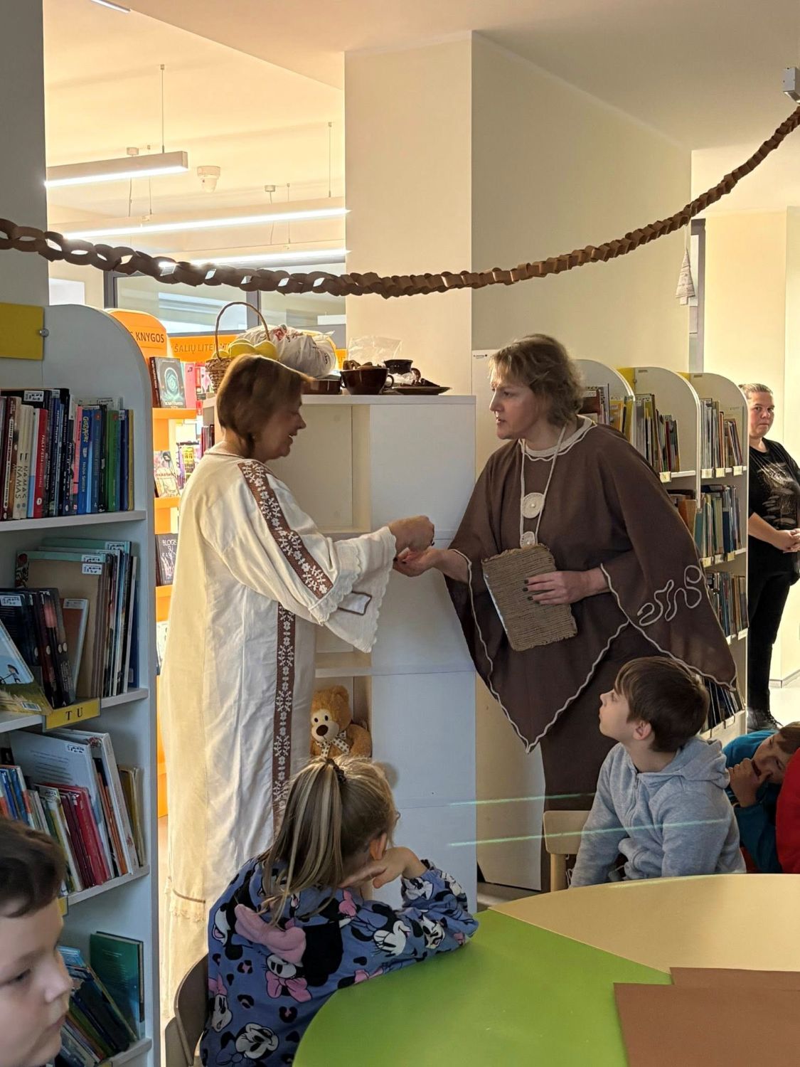 Bibliotekos darbuotojos Lijana, Dalia, Rasa ir Simona supažindino vaikus su senosiomis Kūčių tradicijomis, kartu paruošė simbolinį Kūčių stalą ir papasakojo apie M. K. Čiurlionio vaikystės Kalėdas.
