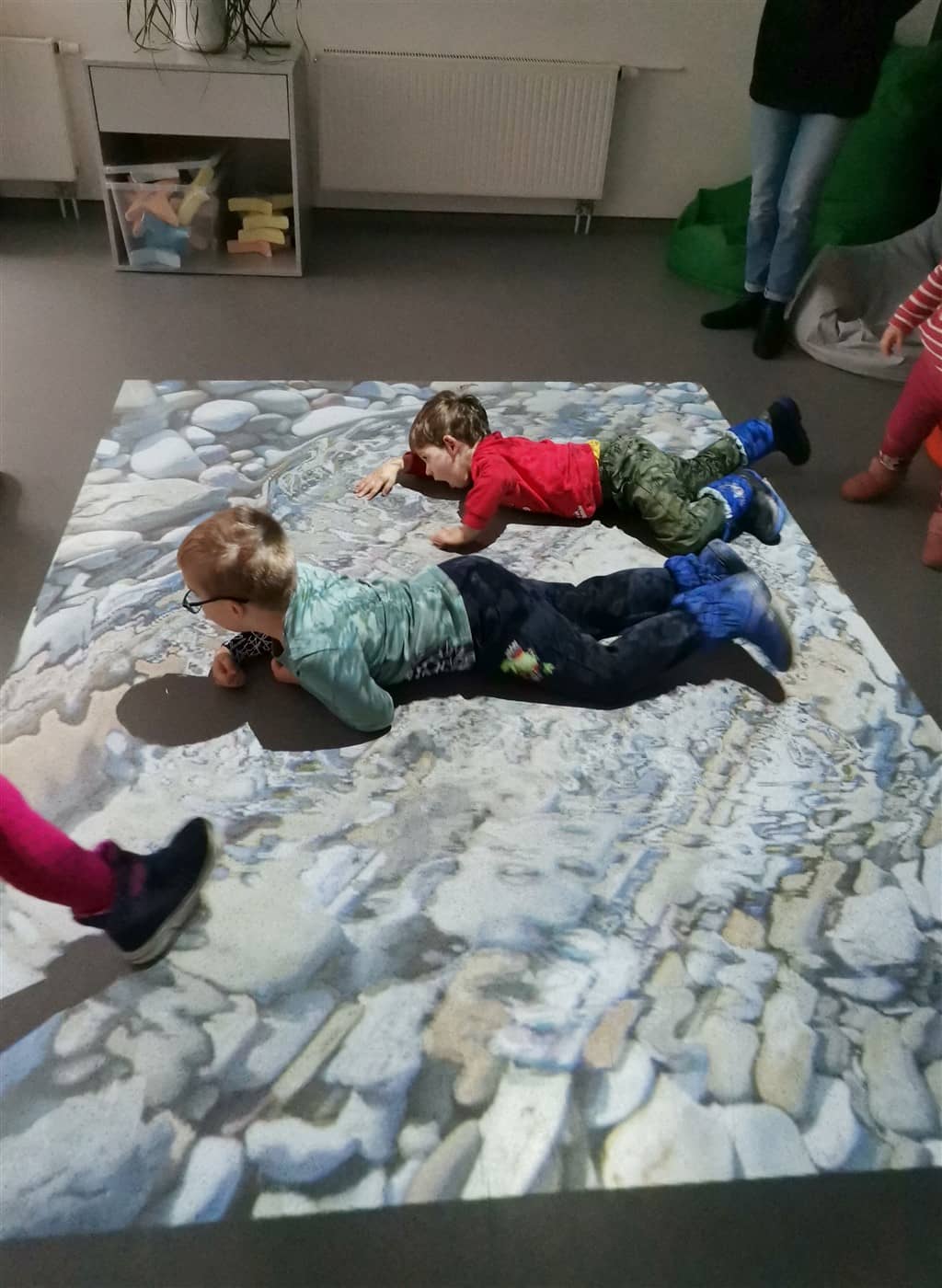 Šeimos kambario ir Žaislotekos darbuotoja Rasa pristatė dalyviams interaktyviųjų grindų žaidimus. Visi ant grindų galėjo braidyti, rinkti kriaukleles, gaudyti indelius su medumi, vaikščioti ant akmenukų, groti pianinu, sprogdinti balionus, šiurenti medžių lapus, sekti žvėrelių pėdomis ir atspėti, koks žvėrelis po jomis slepiasi.