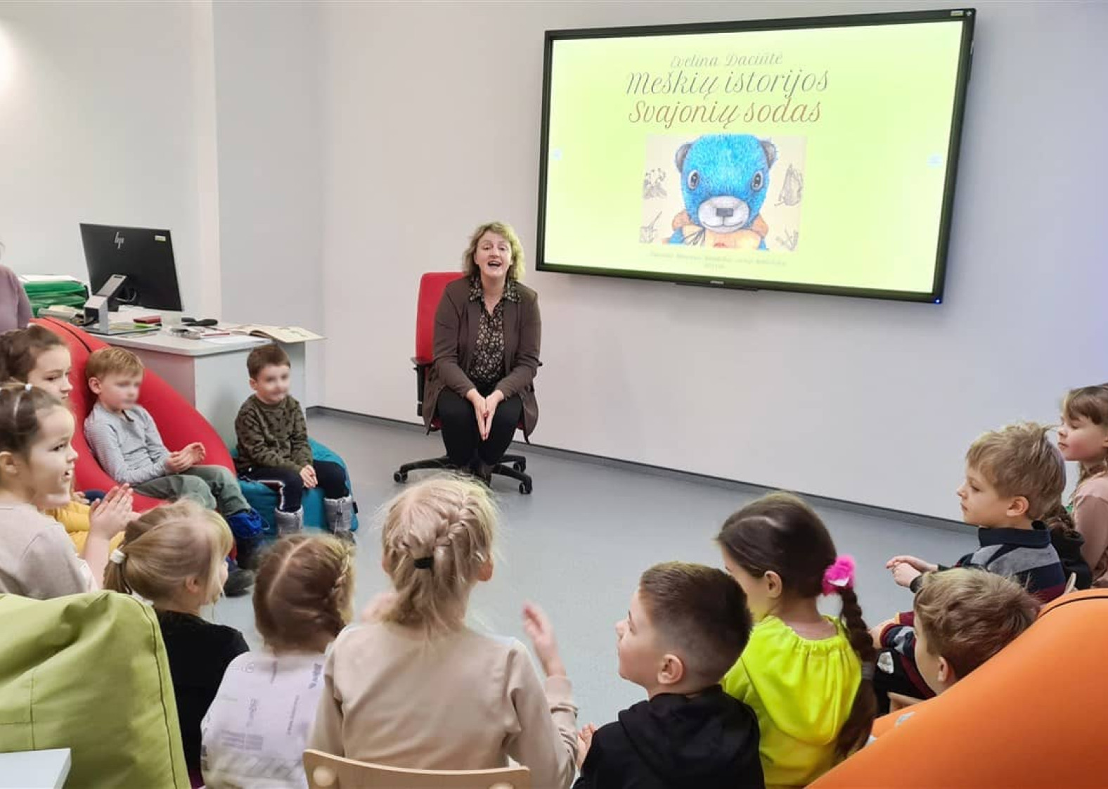 Mažieji svečiai, patogiai įsitaisę ant sėdmaišių, įdėmiai klausėsi istorijų apie meškiukus, kurias susirinkusiesiems vaizdžiai skaitė vyr. bibliotekininkė Lijana Markevičienė.
