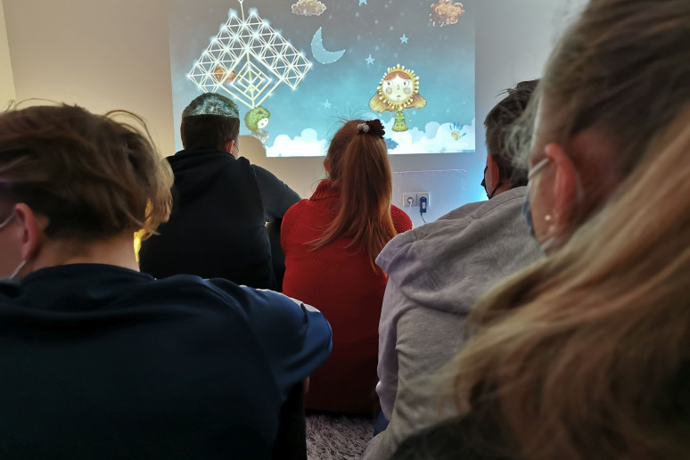 Pojūčių erdvės lankytojams bibliotekos darbuotojai veda sensorinius užsiėmimus: rengia lietuviškos animacijos filmukų peržiūras, o po peržiūrų kviečia išreikšti savo mintis ir emocijas piešiant, grojant būgneliu, susikuriant sau tinkama apšvietimą.