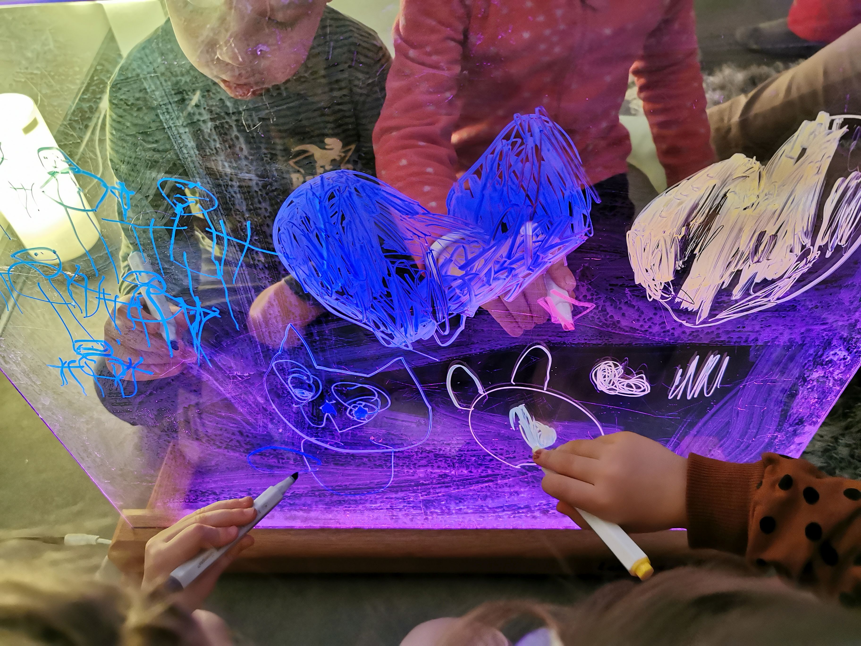 Vaikus viskas domina, jiems norisi viską paliesti, pagauti. Matydami spalvų ir formų kaitą įsivaizduoja įvairias būtybes, klausydamiesi gamtos garsų spėlioja kas juos skleidžia. Užsiėmimo metu vaikai žiūri filmukus, linksmai žaidžia rodydami emocijas. Piešia pirštukais ant šviesos staliukų arba ant šviečiančio molberto. Šviečiančio molberto pagalba piešinys tampa šedevru. Tam, kad būtų dar įdomiau, vaikai piešia iš abiejų pusių vienu metu. Šviesa atpalaiduoja ir išlaisvina kūrybinę galią, pritraukia dėmesį ir sužadina smalsumą. Pojūčiu erdvėje didelio susidomėjimo sulaukia mėnulio būgnas. Šis instrumentas ypatingas savo paprastumu, o groti juo gali kiekvienas, pradedant vaiku ir baigiant senoliu. Grodami kiekvienas keliauja savu keliu ir nusiramina.