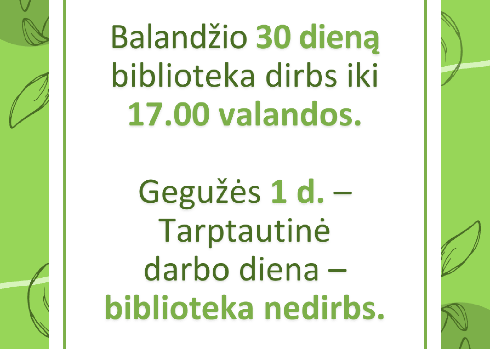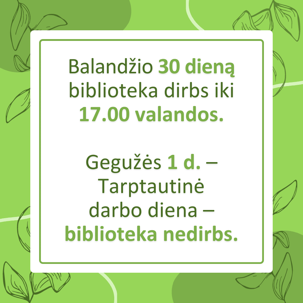 Bibliotekos darbo laikas balandžio 30 – gegužės 1 d.