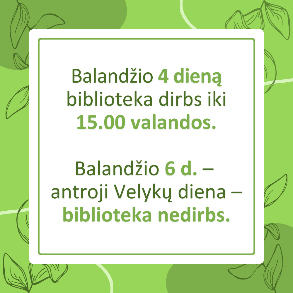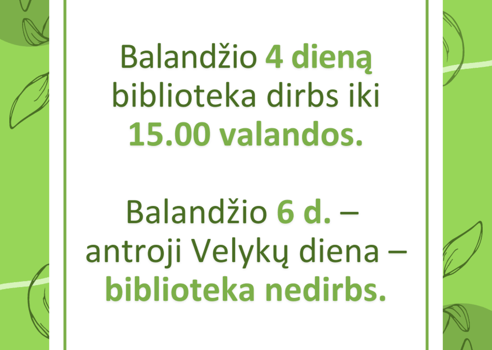 Informuojame, kad balandžio 4 d., šeštadienį, biblioteka dirbs viena valanda trumpiau.