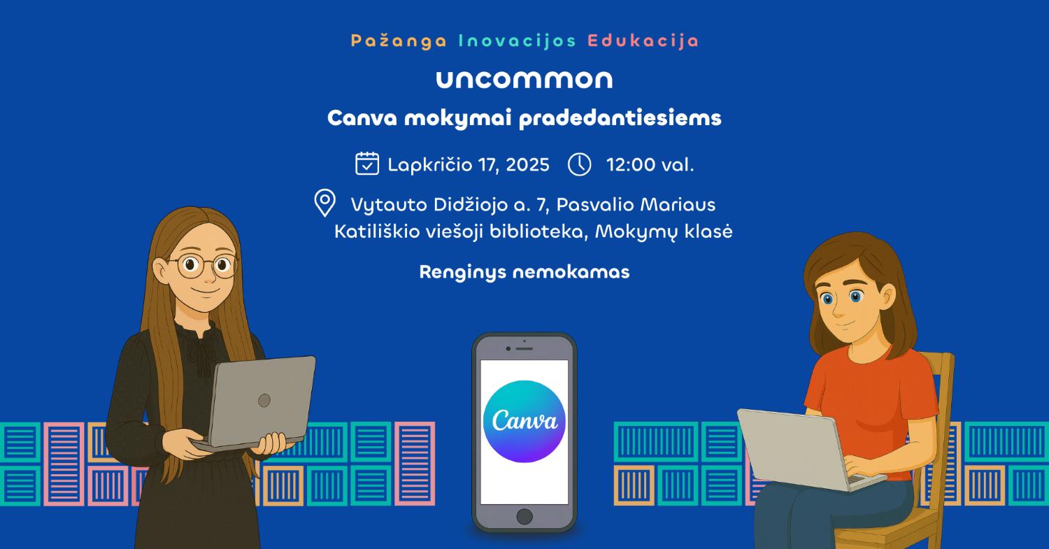 Mokymų metu susipažinsite su pagrindinėmis programos funkcijomis ir sužinosite, kaip vos keliais paspaudimais sukurti estetiškus plakatus, kvietimus ar socialinių tinklų įrašus.